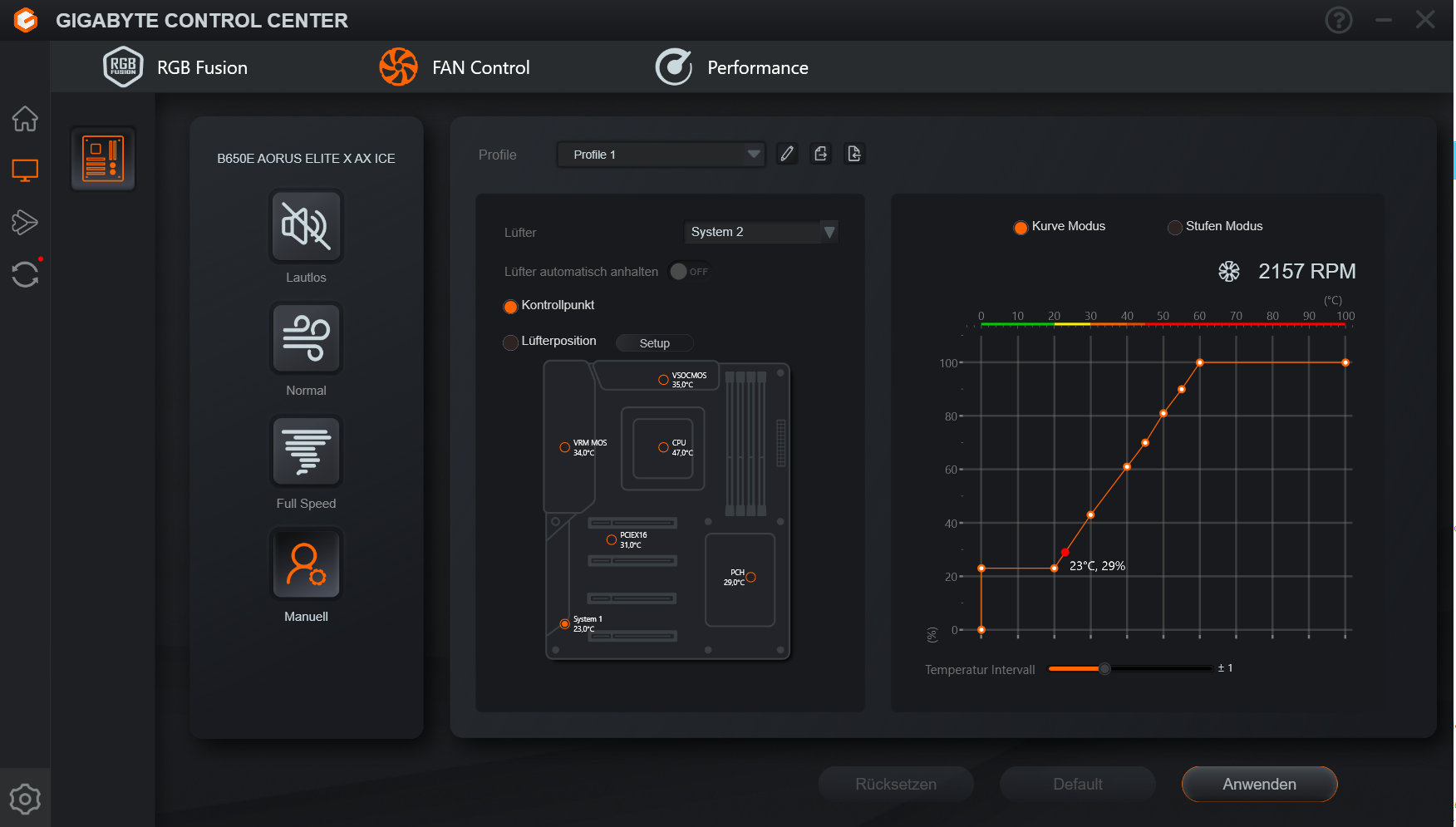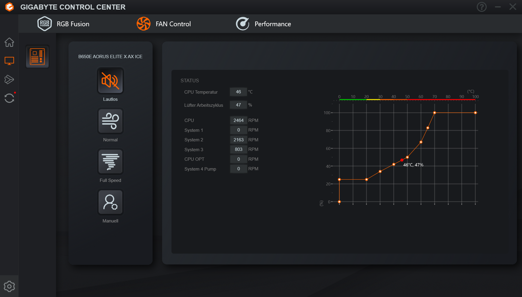 Die drei Lüfter in der Front des Gehäuses lassen sich nicht steuern bzw. einstellen (nur die RGB lässt sich einstellen) und laufen mit maximaler Drehzahl. Die Drehzahl wird aber sowohl im BIOS als auch im Gigabyte Control Center angezeigt (s. Screenshots). Den hinteren Lüfter kann ich problemlos steuern. Dieser läuft auch mit einer angenehmen Drehzahl. Ich habe im BIOS und auch im Gigabyte Control Center die Lüfterkurve angepasst. Es ändert sich aber nichts.
