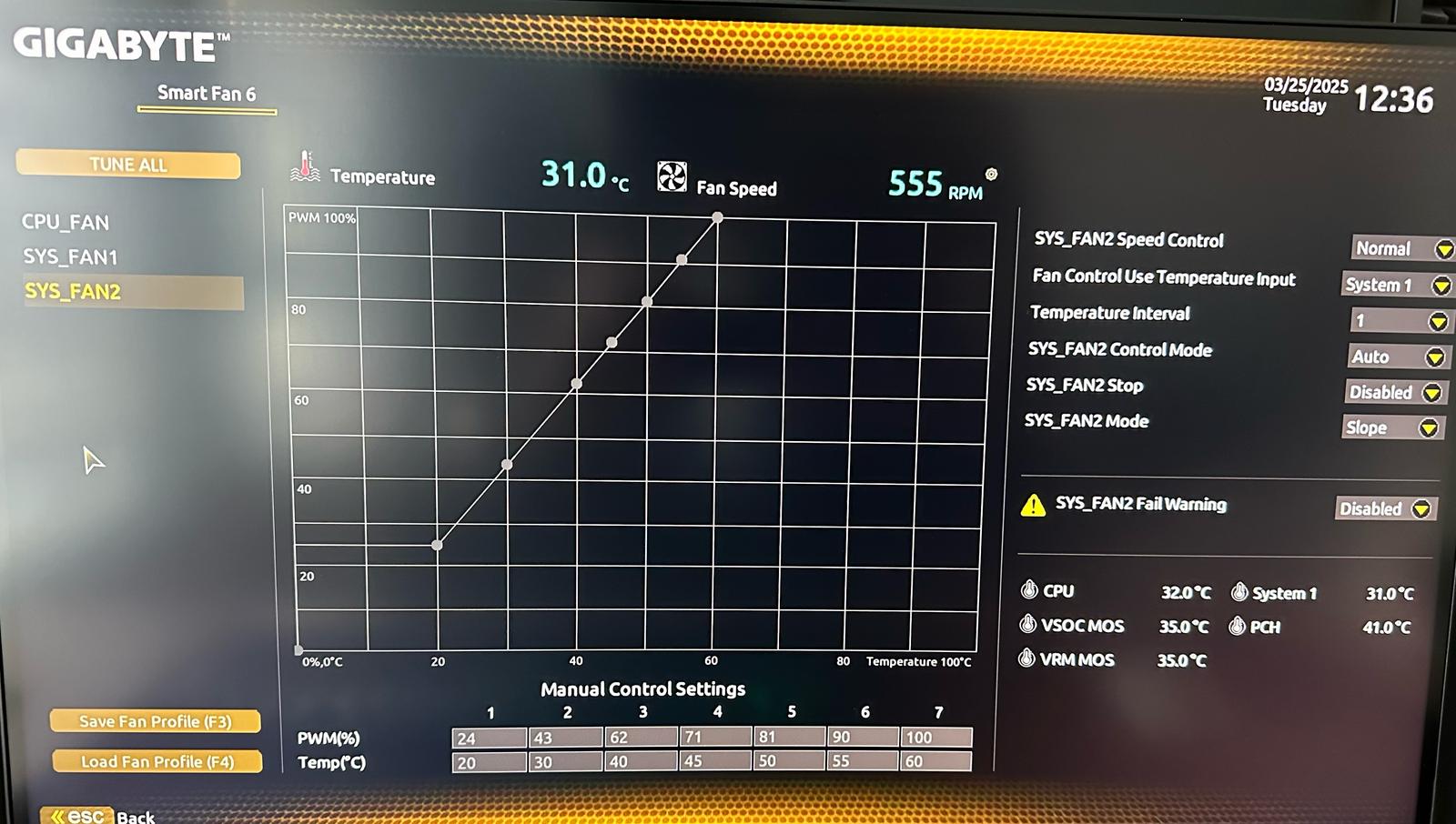 Wenn ich den PC anschalte drehen alle Lüfter ganz normal, nach dem BIOS Startup hören alle Lüfter kurz auf zu drehen und drehen dann wieder weiter (soweit ich weiß ich das ja ganz normal). Jedoch drehen sich die zwei vorderen Lüfter am Gehäuse nicht mehr weiter und bleiben stehen, aber nach ca. 10 Minuten fangen die sich an wieder zu drehen. Ich habe mir im BIOS die Lüfterkurven angeschaut und eigentlich sollten die sich konstant drehen und nicht erst nach erreichen einer bestimmten Temperatur (ca. 25% Lüfterleistung ab 0 Grad). Wenn ich zb den PC neustarte dann kommt dieses Problem gar nicht und die Lüfter drehen ganz normal weiter.
