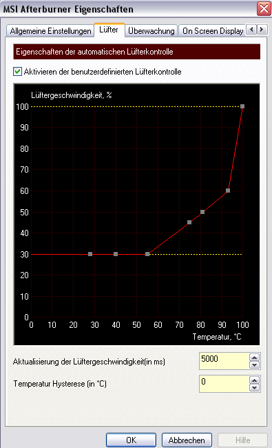 Nun habe ich mal getestet. Wenn ich die Lüftergeschwindigkeit auf 45% manuel runter stelle, wird die Karte so ca. 85° warm. Der Lüfter ist dann DEUTLICH leiser und rennt nicht so. Bei NVIDIA steht die Karte hätte 96C° betriebstemperatur.
