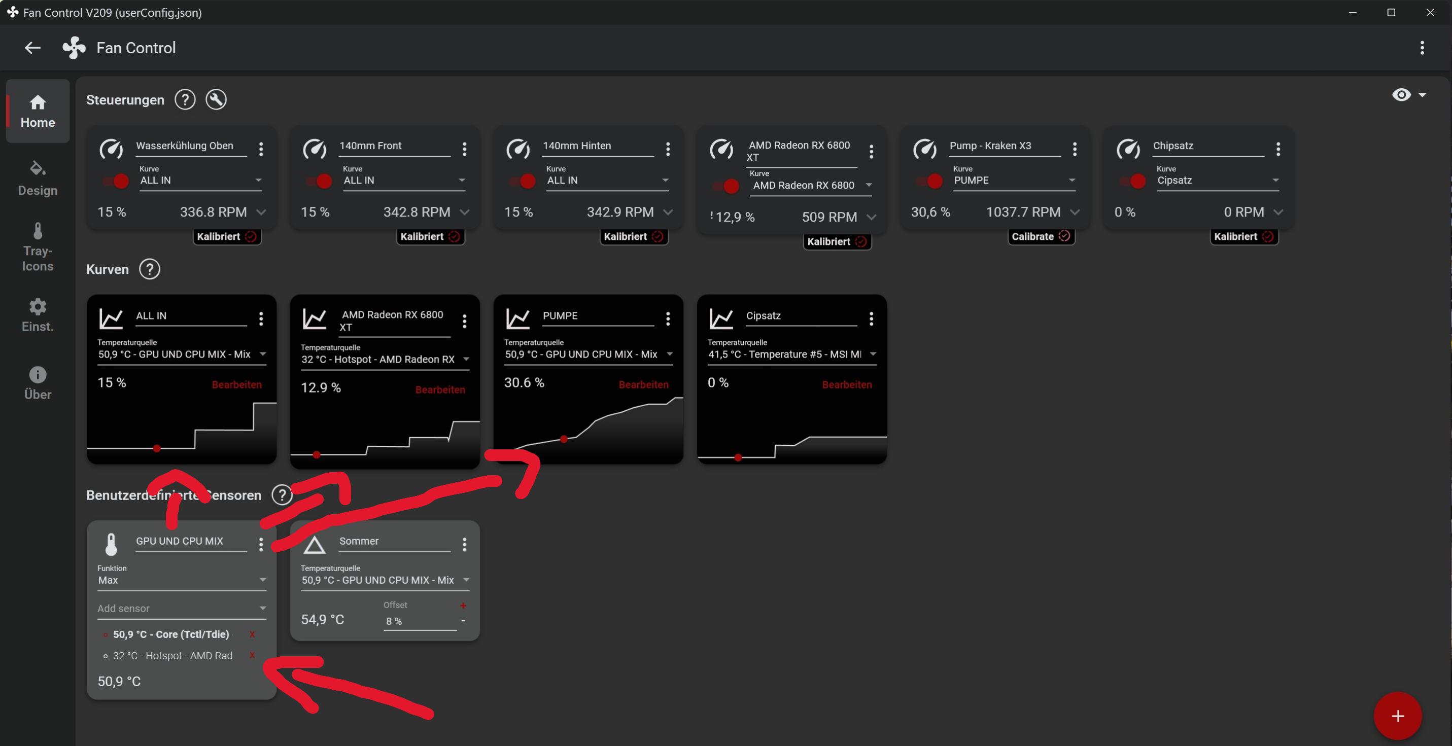 Also ich habe alle 6 Lüfter die gleiche Drehzahl verpasst im Desktop Betrieb also für Office Anwendungen und Internet mit 600U/min