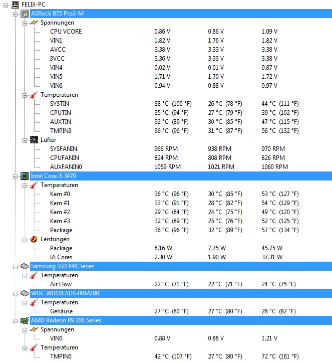 3x Enermax 12cm Vegas Duo (~800 u/min) + 1x Raijintek Aeolus Alpha (dank PWM-Anschluss 1100 u/min)