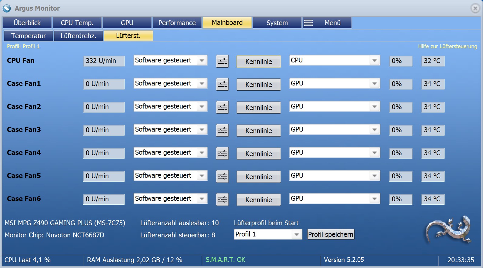 - Gehäuselüfter: Anhand der Lufttemperatur am Gehäuseausgang