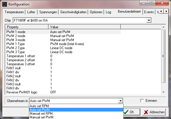 Sofern ein Mainboard es unterstützt, kann man bei Speedfan in den erweiterten Einstellungen wählen, ob man per PWM oder Spannung regeln möchte (siehe Screenshot).
