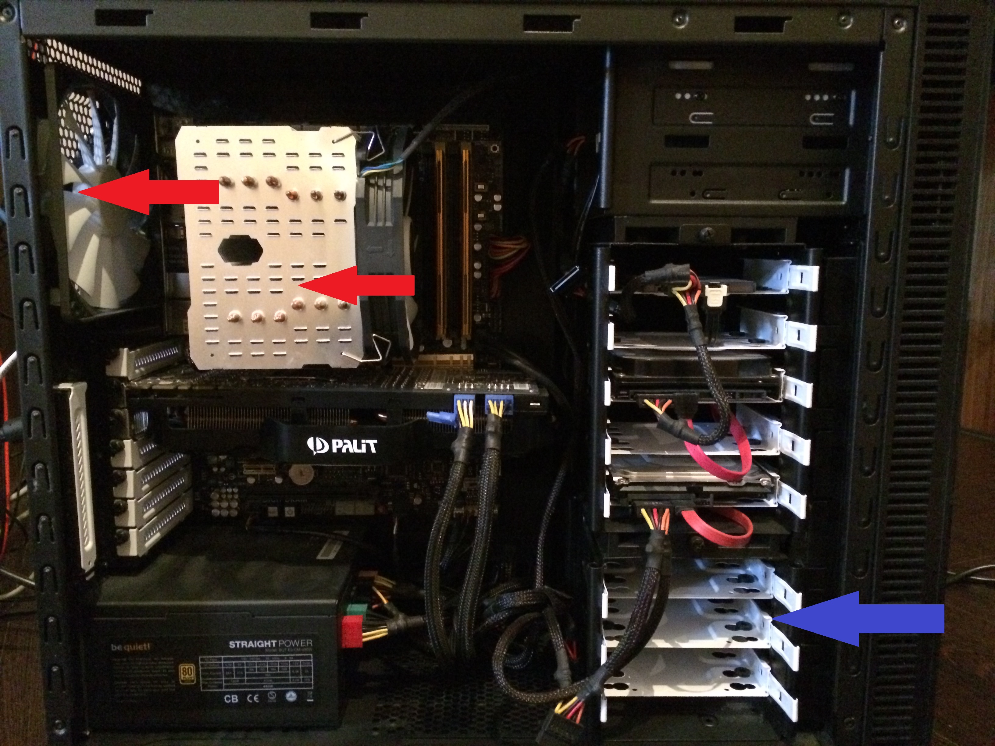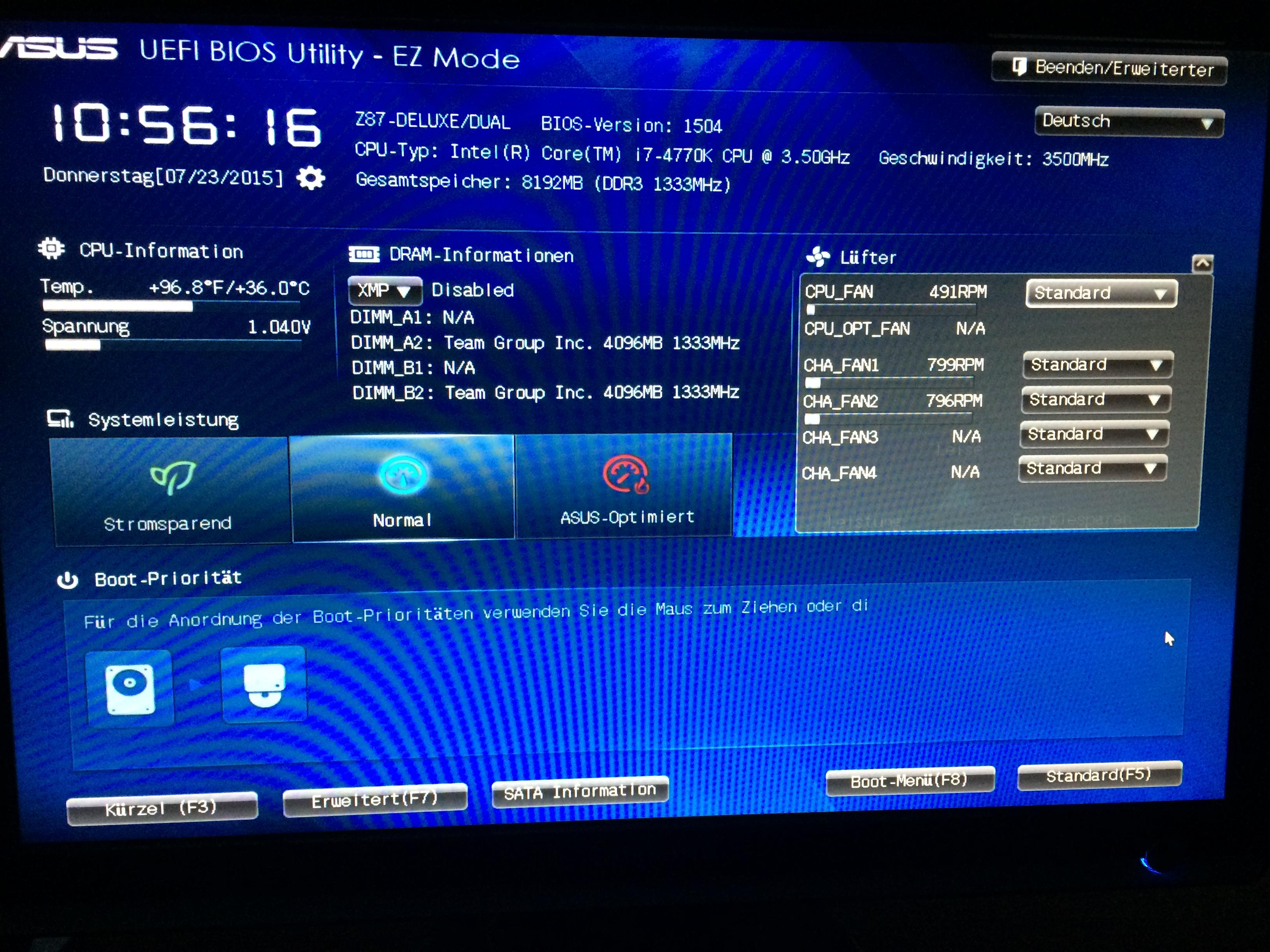 Als Anmerkung, der Rechner steht im Dachgeschoss bei ca. 30°C Raumtemperatur bei momentan herrschenden Außentemperaturen von 34°C. Für mich sollte der PC leise sein aber bei Last eben gut Kühlen. Der CPU-Kühler ist ein Thermalright HR-02 Macho Rev.A.