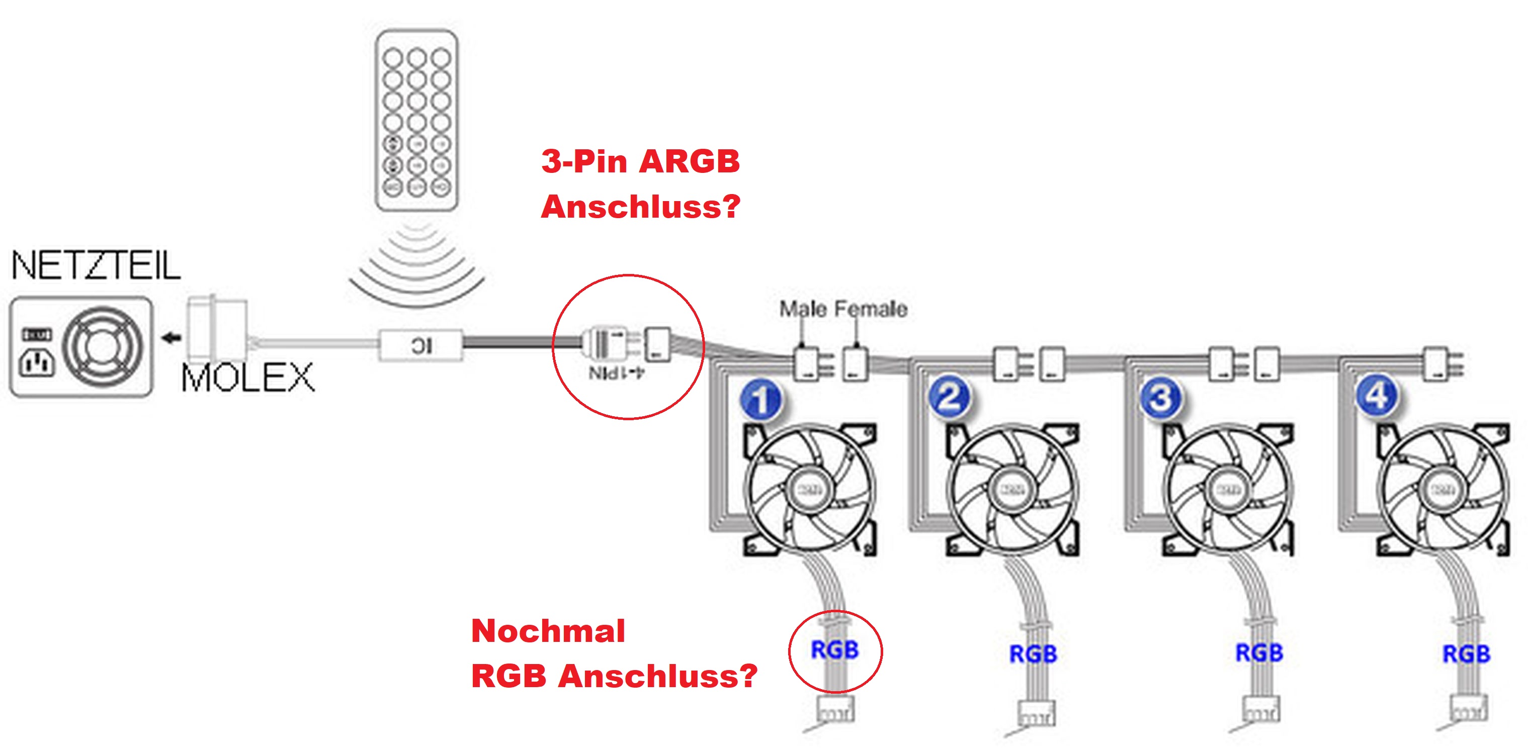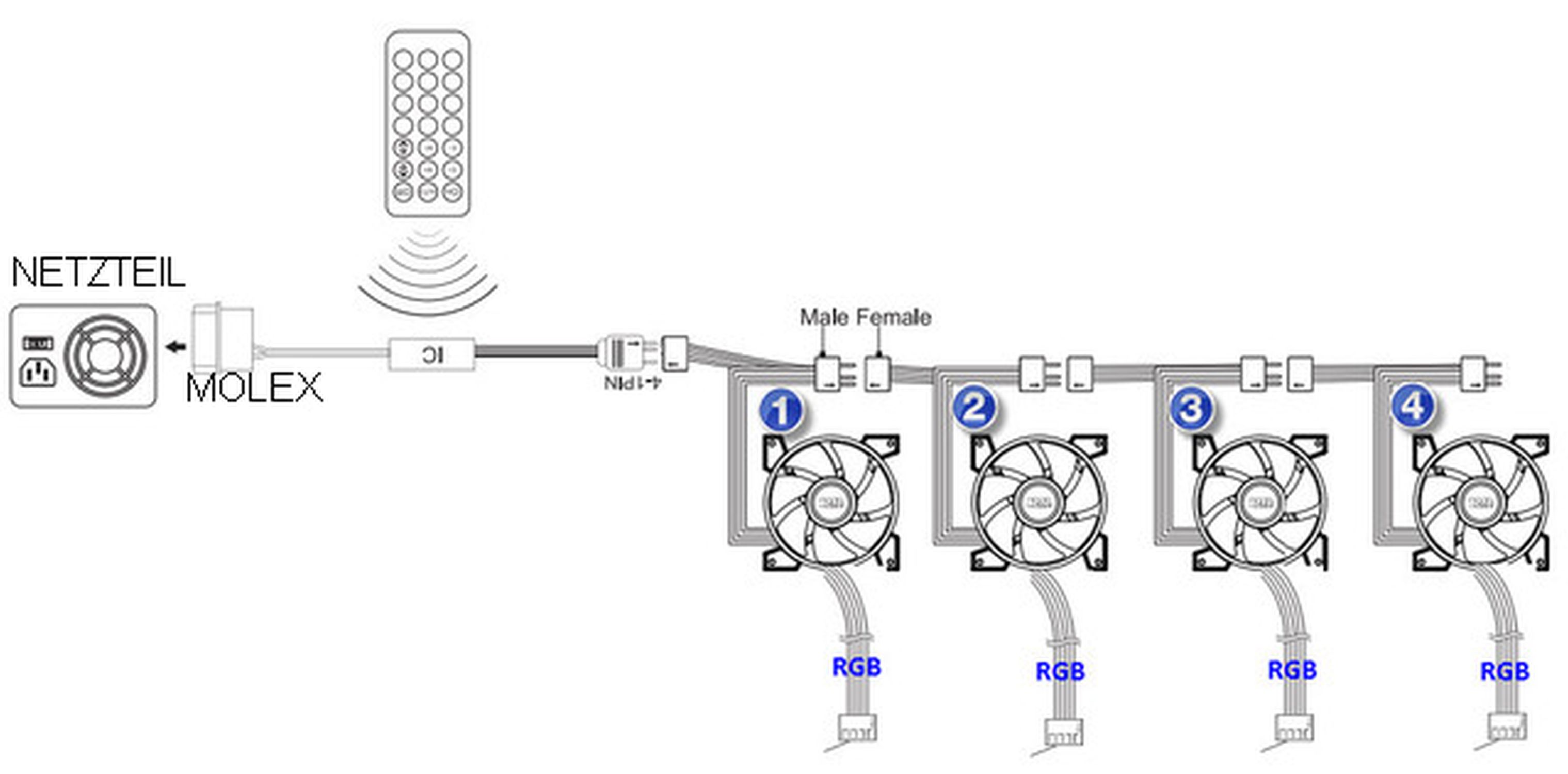 habe mir ein recht günstiges set mit 4 rgb lüftern gekauft. nun bin ich mir aber nicht sicher, wie das korrekt angesteckt bzw angeschlossen werden soll. könnt ihr mir evtl. weiterhelfen?