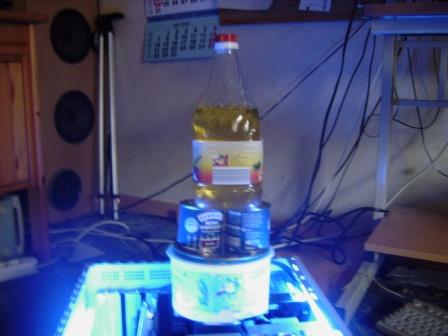 eine keramikfliese, Eine plastikdose zum schutz, darin eine große dose BOCKWÜRSTCHEN, darauf 2 dosen Metall-schutzlach, darauf 2L frittierfett (in plastikflasche)