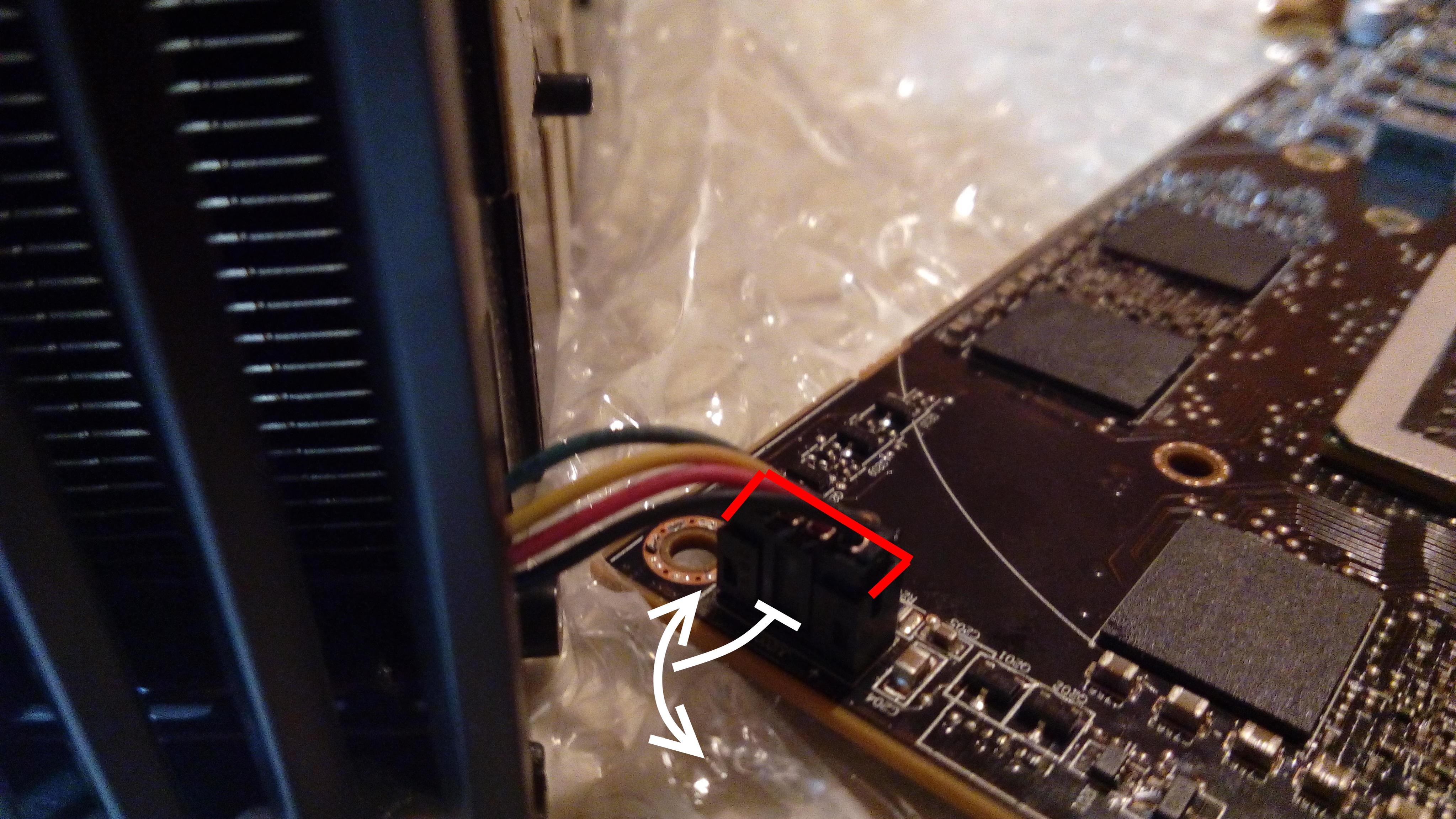 Der Kühlkörper ist auch schon ab - aber ich bekomme das Kabel des Lüfters nicht ab.
