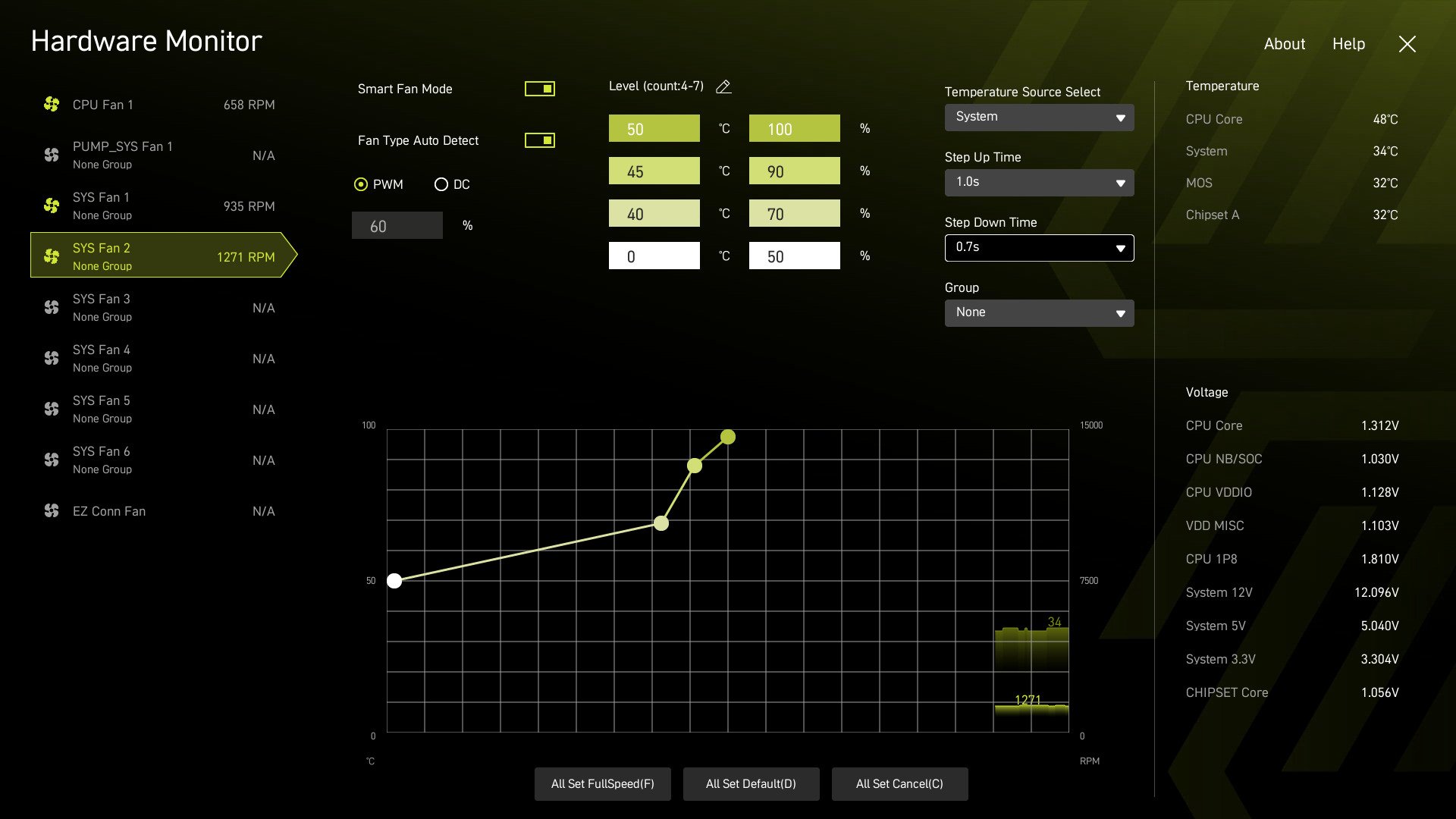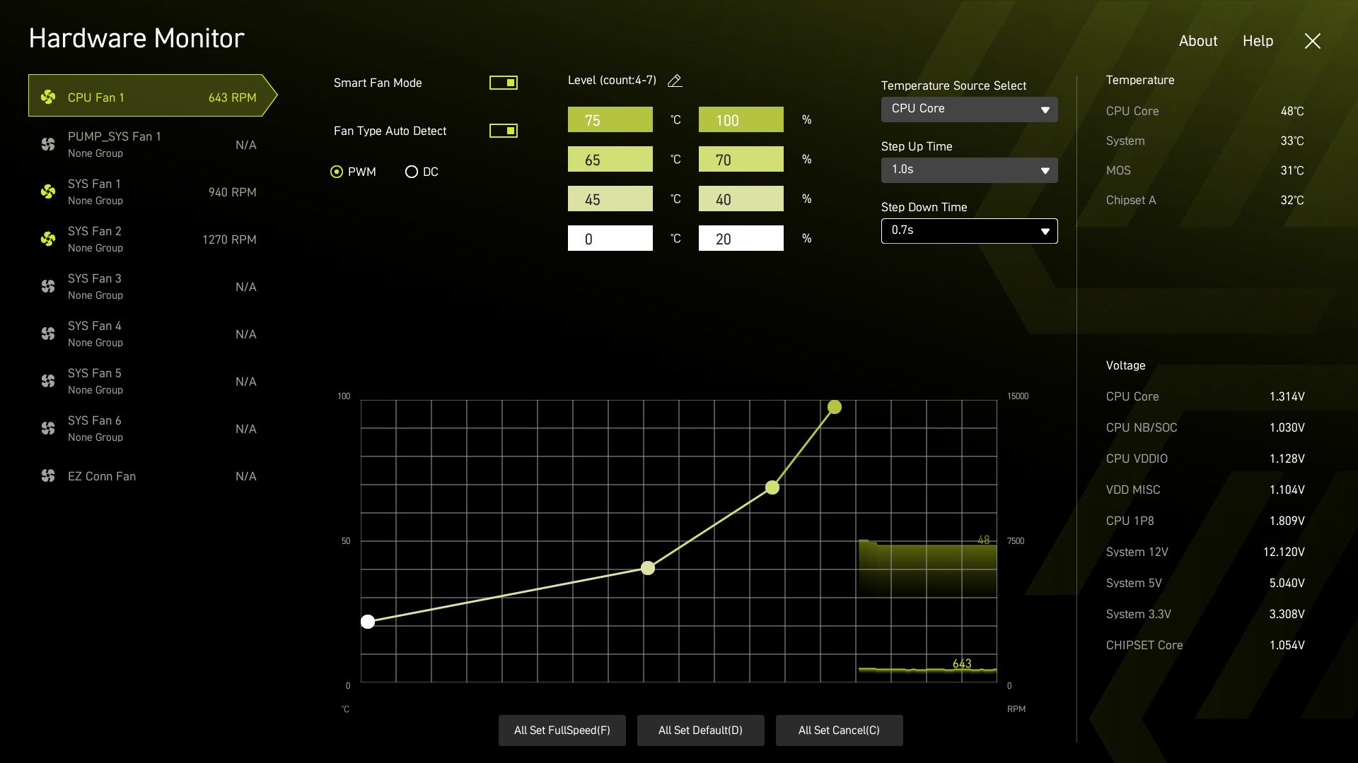 Das wird gerade mit einem kalten neugestarteten PC angezeigt. Da ist das Mobo bei 40°, nach einiger Zeit werden um die 45° angezeigt, aber keine Ahnung, ob die Werte stimmen.