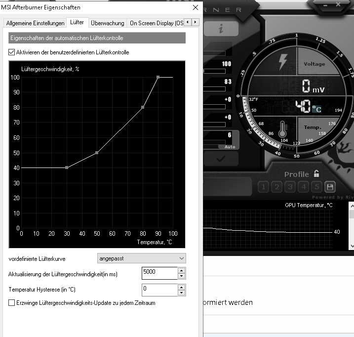 Habe eine gtx 1080 möchte mit afterburner eine gute kühlung erzielen, da meine grafikkarte einen fanmodus hat ist sie immer 52 grad warm was mir etwas zu warm ist im ruhemodus/normal betrieb!