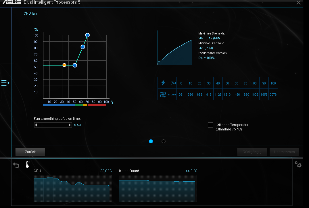 50% also 1300 RPM bei 50 Grad ist zuviel, hast ja nur 33 Grad CPU Temp.