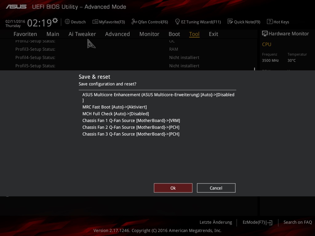 Wie in dem angehängten Bild zu erkennen, laufen die Lüfter aktuell bei 30% (540 RPM). Ab 65°C dann mit 40% und ab da hoch zu den 100%.