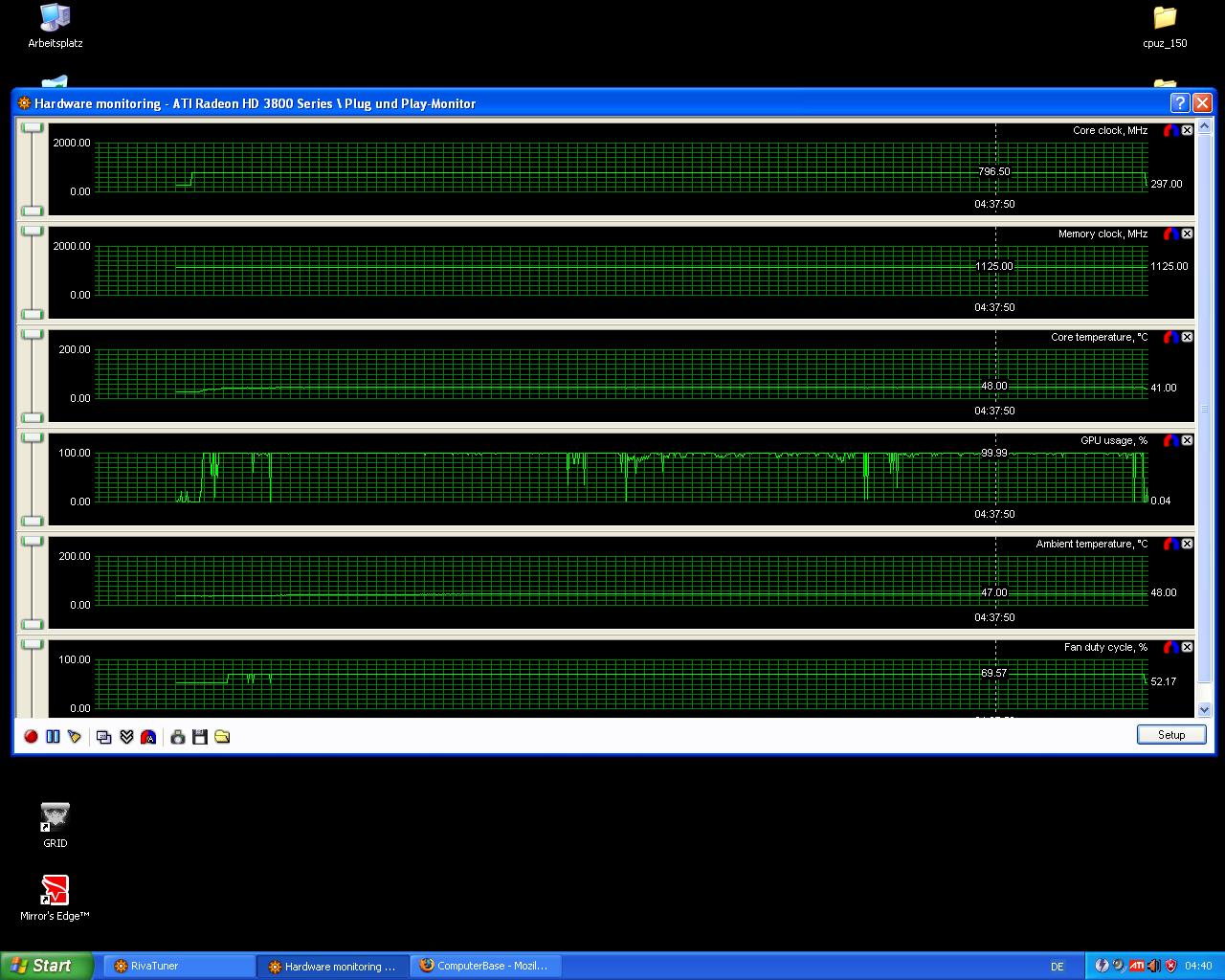 Ich hätt da son Problem mit meiner HD3870 von MSI. Es geht darum, dass sie mir zu laut ist(vor allem unter Last). Ich hab mich jetzt doch dazu entschlossen den cube am fernseher anzuschließen und so Filme zu schauen und Spiele zu spielen und da is die Lautstärke dann doch wichtig. Jetzt zur eigentlichen Frage. Kann ich im CCC die Lüftergeschwindigkeit regeln lassen?? Ich hab bis jetzt noch keinen Eintrag gefunden und den Riva tuner wollte ich eigentlich nicht dazu nutzen, außer hier sagt mir jetzt jemand, dass das ohne Probleme und sehr gut funktioniert. Die Temperatur der GPU ist unter Last denk ich mal ok, von daher müsste sich doch die ein oder andere U/min abschalten können, oder lieg ich da falsch? unten noch ein Bild mit der GPU-Temp unter Last.
