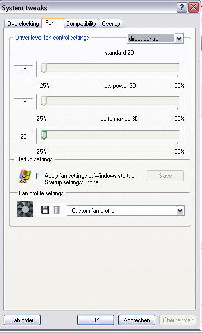 Die Karte hat ein automatisches 2D Underclocking von Haus aus dabei (300/100/600), was gut funktioniert, allerdings sind mit diesen Einstellungen in meinem System sicher keine 1350 rpm am Lüfter nötig, man hört zwar nicht so viel, 800 wären aber lautlos und würden reichen.