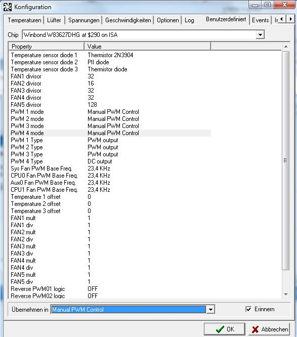 Moros schrieb:5) Im Menü "Temperaturen" kannst du einstellen welcher Lüfter in Abhängigkeit von welchem Temperatursensor geregelt werden soll. Hierbei muss man aber die Besonderheit deines bzw. der Asus-Boards berücksichtigen. Der verbaute Chip wäre eigentlich in der Lage alle Lüfter separat zu steuern. Leider hat Asus alle 3pin-Anschlüsse zusammengeschlossen. Deshalb werden die CHA_FAN Anschlüsse alle gleichzeitig über Speed01 geregelt. Deshalb verändert sich auch nichts, wenn du Speed02 anpasst.