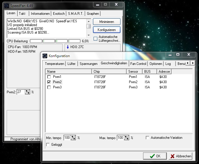 Ich würde ich an deiner Stelle noch einmal in aller Ruhe Punkt für Punkt der Speedfan-Anleitung durchgehen und die Software noch einmal konfigurieren. Oft ist der Fehler trivial. Speedfan ist im Grunde alles andere als eine komplizierte Software, wenn man einmal durchgeblickt hat