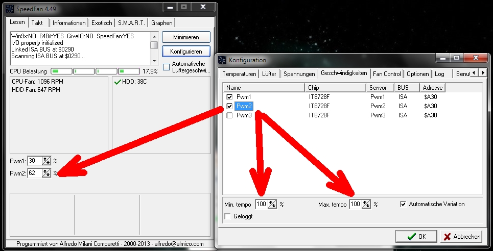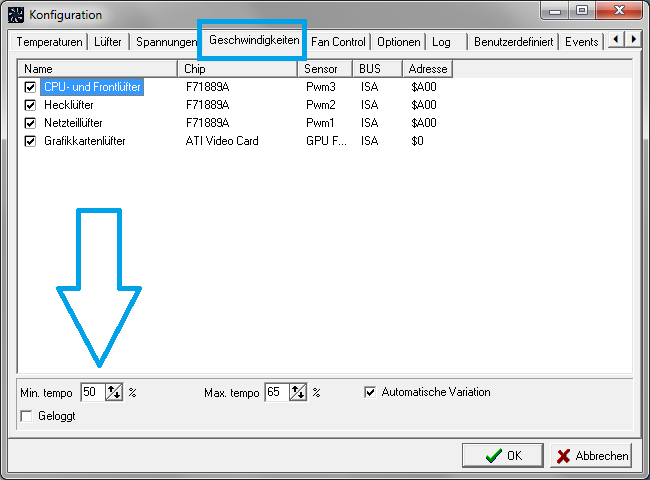 Yep! Einmal die Zuordnung Temps-Lüfter richtig einstellen, dann noch die Temperaturschwellen anpassen.Speedfan ist im Grunde alles andere als eine komplizierte Software, wenn man einmal durchgeblickt hat .