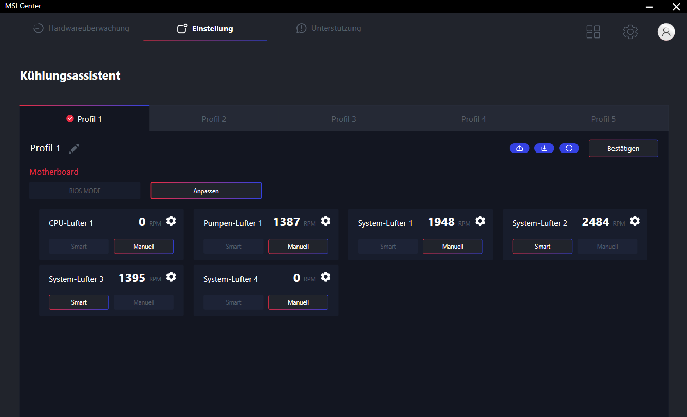 Wie kann ich mit dem MSI Center meine Lüfter vernünftig einstellen? Muss ich es im Notfall über das BIOS machen? Gibt es da noch andere Lösungen? Aktuell läuft halt alles auf 100%, was extrem stört und laut ist. Danke im Voraus.