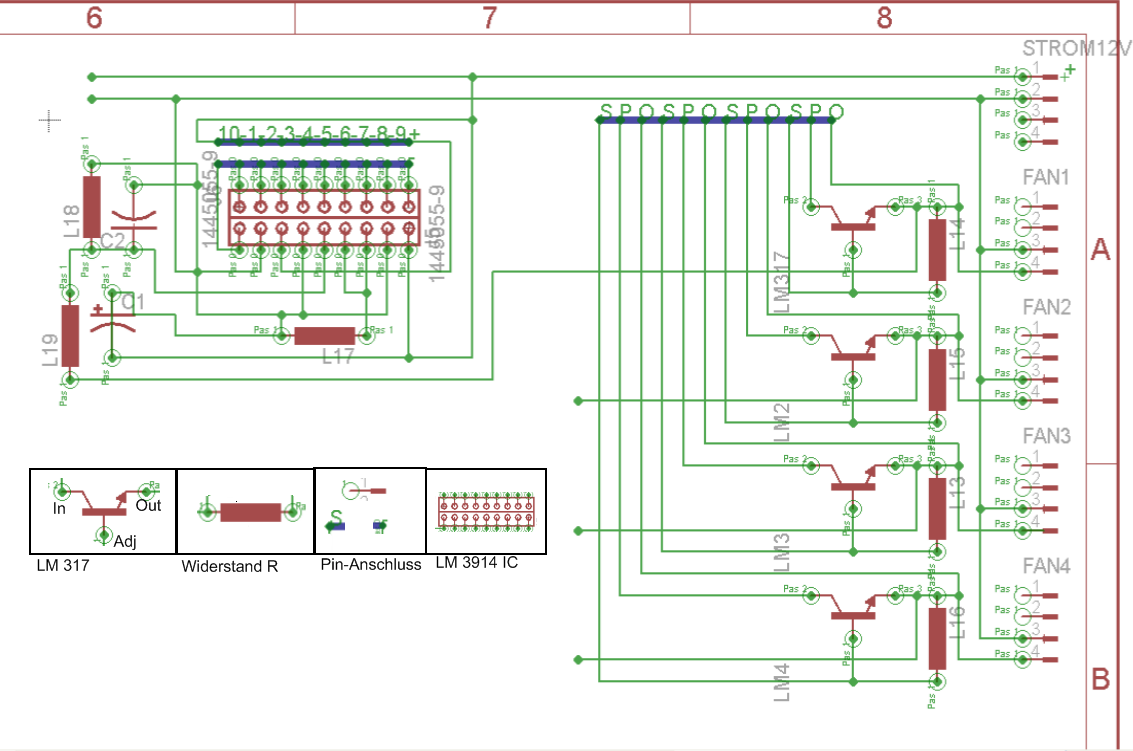 - Manchmal hab ich nicht die ganz richtigen Symbole verwendet (z.B. LM 317), weil ich sie nicht gefunden hab, oder weil die richtigen Teile für mich nicht anschau lich genug waren (Beim LM 3914 waren auf der linken Seite nur 5 Pins und auf der anderen Seite 13)