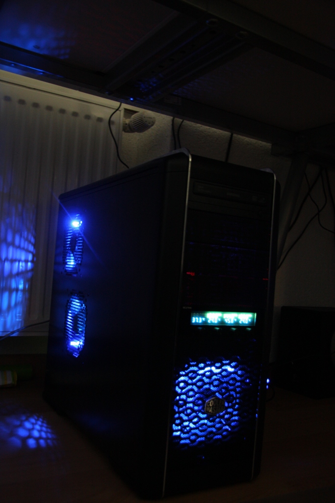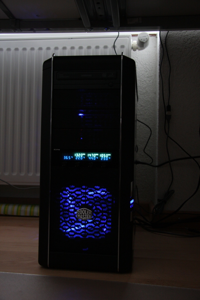 wollte bei mir mal ein bissel aufpeppen und hab mir mal zwei Coolermaster Lüfter mit Led besorgt. Machen ja bei ca 2000 Umdrehungen ca 19dB. Dachte eigentlich das sei ganz ok. Im Gehäuse habe ich ja die drei Standardlüfter vorne, hinten,seite verbaut. Habe jetzt noch einen oben verbaut und wollte den Seitenlüfter durch den Led ersetzen.