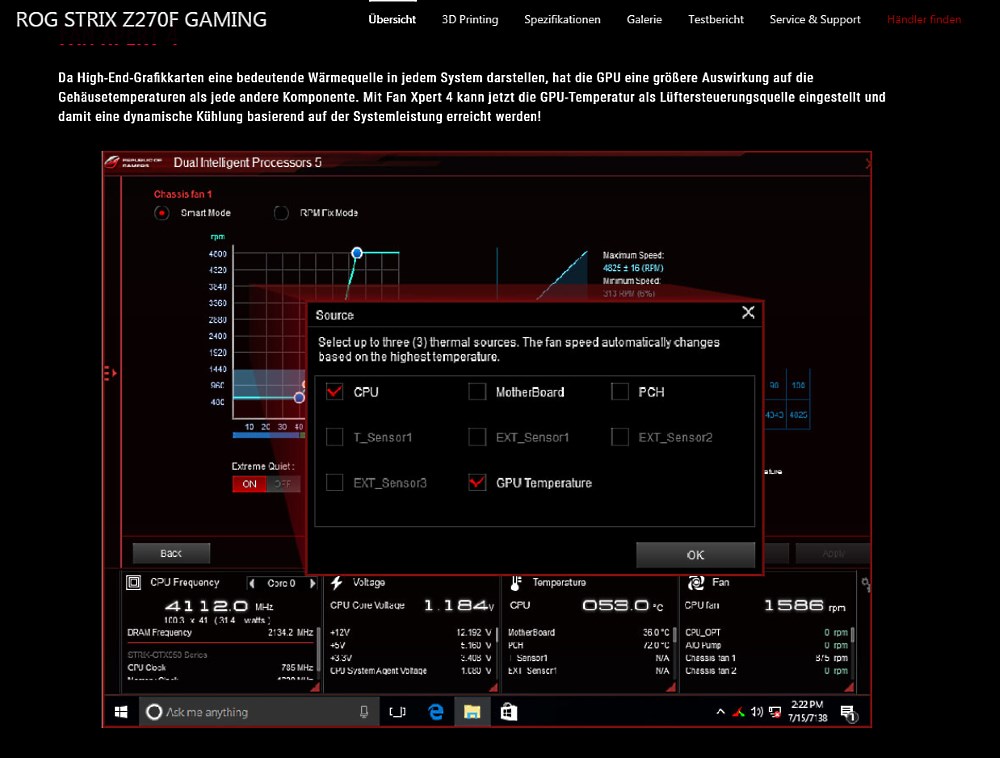 Aber hier redest du sicherlich nicht vom UEFI, richtig? Ein UEFI mit Steuerung basierend auf der GPU-Temperatur wäre ne feine Sache. Die meisten Mainboards können ja bereits nach einem externen Sensor regeln, die GPU-Hersteller bräuchten also nur einen Temperatursensor-Ausgang auf dem PCB.Killa Priest schrieb:Ich bin beim Z270 Chipsatz deswegen von MSI zu ASUS gewechselt, da die Gehäuselüfter auch in Relation zur GPU-Temp gefahren werden können.