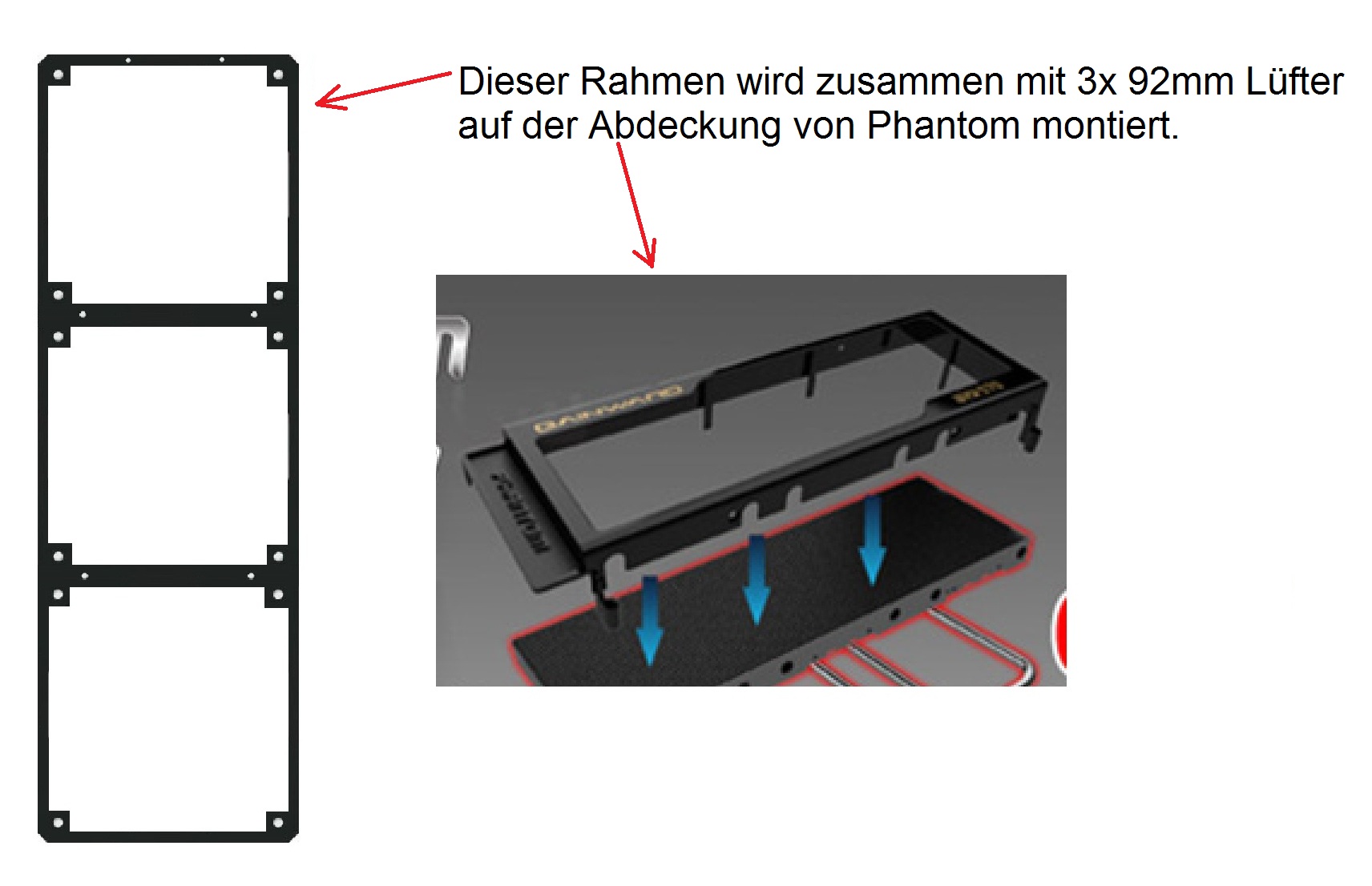 Ich habe noch ein 80mm Silent Wing USC hier Rumliegen und habe es gerade auf dem Phantom Kühler Druff gelegt. Der Kühler ist nur paar Millimeter breiter. Also wären 3x 92mm Lüfter ziemlich gut für den Kühler.