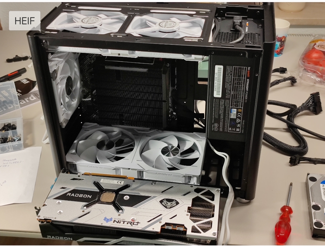 Hallo zusammen, hab mich leider total vertan in den Maßen. Nun hab ich hier am Jonsbo D30 einen 120er Phanteks D30 einblasend von hinten und 2 Phanteks D30 140er am Deckel ausblasend. Das NT hat auch einen 140er und ist ausblasend. Da kommt vermutlich zu wenig Luft rein und ich hab nicht im Ansatz überdruck also gibt's noch schön Staub. Plan war 2 140er Phanteks D30 am Gehäuseboden einblasend noch ch dazu.Meine Sapphire rx6800 Nitro ist zu fett (2 1/2 Slot) und hab zum Boden nur noch etwa 17mm Platz. Frage nun probieren o evtl. noch 2 schmale 140er auf den Boden. Da gibt's ja auch welche die nur 15mm hoch sind von jonsbo. Evtl. habt ihr noch eine Idee? LG Alex