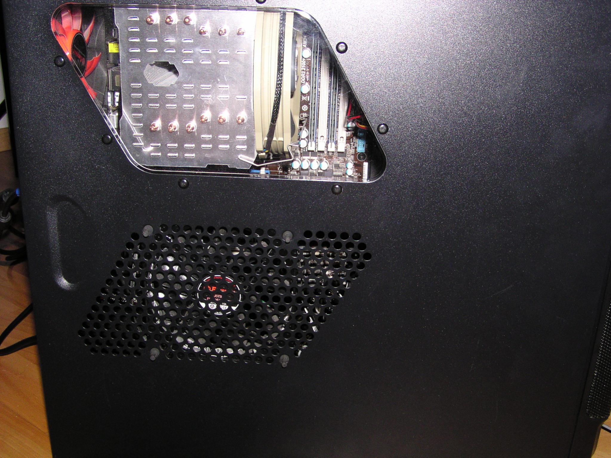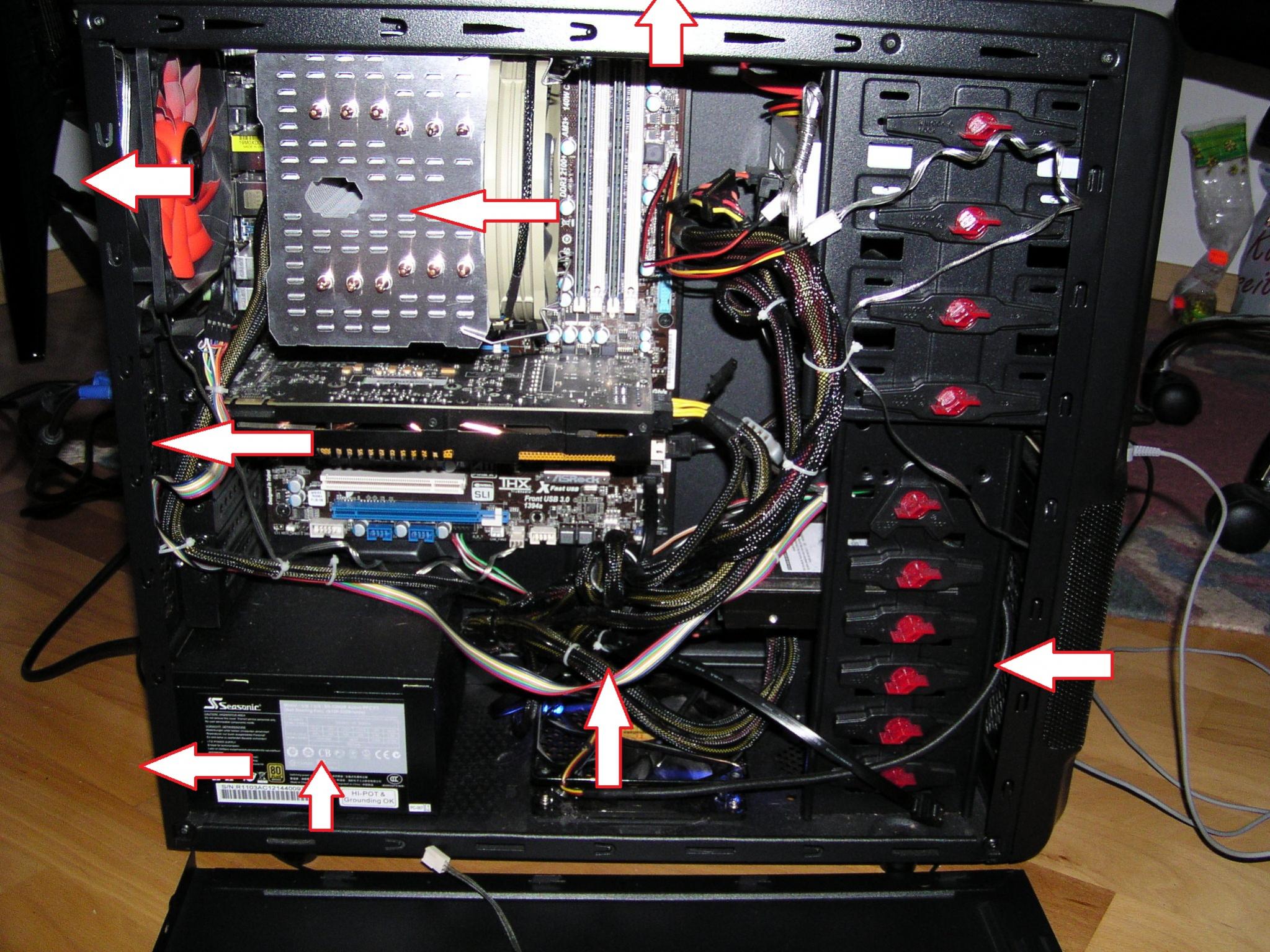 ich hab zur Zeit mein Gehäuse mit 5 Lüftern gekühlt, 3 Lüfter sind Enermax TB12, ein Lüfter ist ein Enermax Magma 12cm, und noch der ursprünglich im Gehäuse verbaute Lüfter. Auf der CPU sitzt ein HR-02 Macho. Restliche Hardware steht in der Signatur. Da meine Graka undervoltet aber immernoch etwa 85° erreicht, und meine CPU wohl auch mit 60° unter Last etwas Kühler sein könnte, wollt ich euch mal fragen, ob meine Kühlung im Gehäuse so überhaupt ok ist. Wie man auf Bild 1 sieht, saugen die Lüfter vorne und unten Luft an, der Lüfter im Seitenteil (siehe Bild 2) bläst raus, ebenso wie der Lüfter hinter der CPU (was mir sinnig erscheint) und der Lüfter der oberhalb vor dem Macho sitzt (hier hab ich Zweifel, wollte den ursprünglich genau über dem Macho montieren, aber der Kühlkörper war einfach zu groß). Ich hab das Gefühl, hier könnte auch weniger mehr sein, oder täusche ich mich? Manche sagen ja, lieber nen Unterdruck erzeugen, andere behaupten widerrum das Gegenteil.