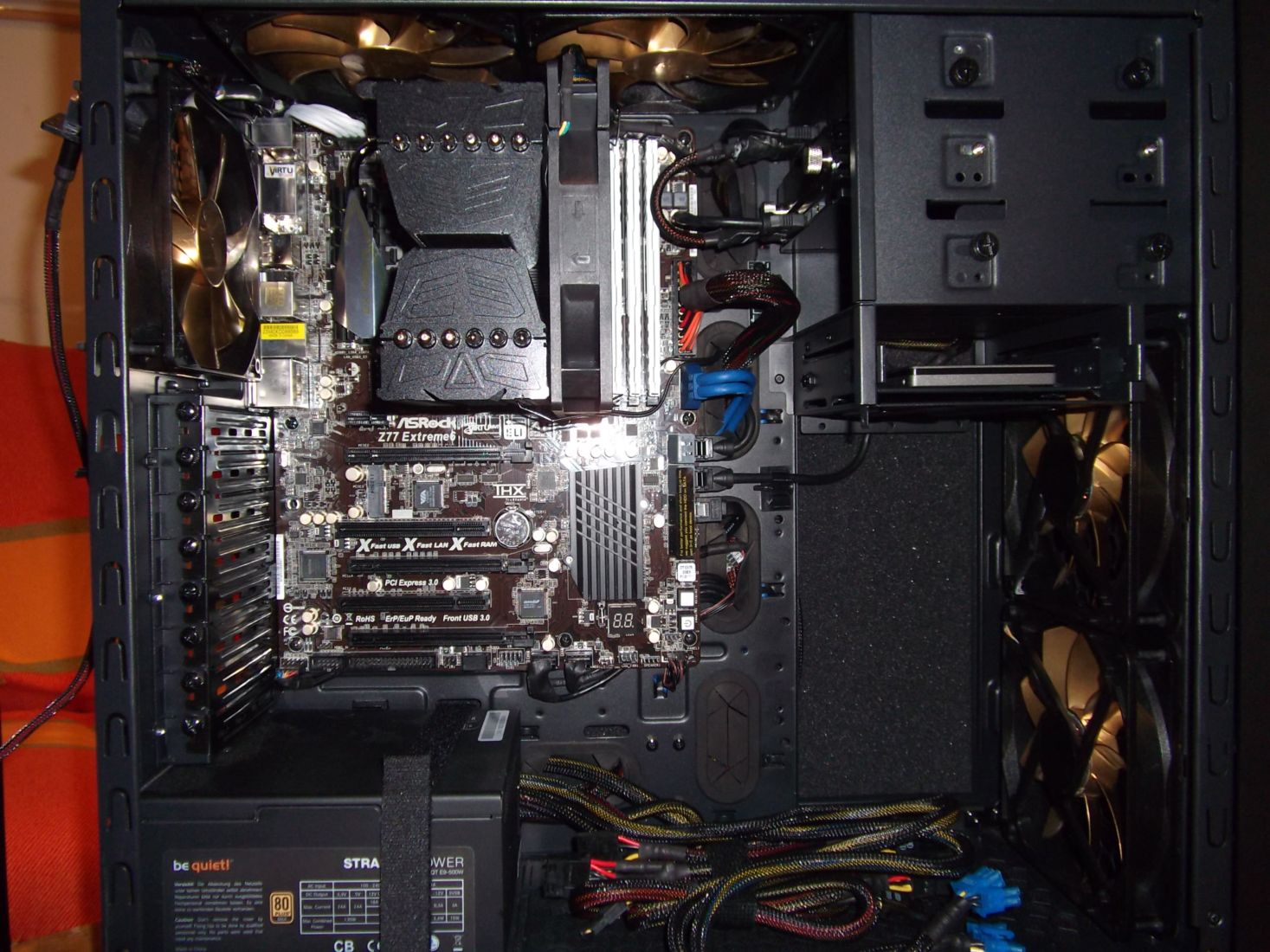 Ebenso weiß ich nicht, was ich mit dem ganzen Kabelsalat machen soll. Das hängt alles mehr oder minder da unten rum, warscheinlich behindert das den Luftstrom auch ungemein.