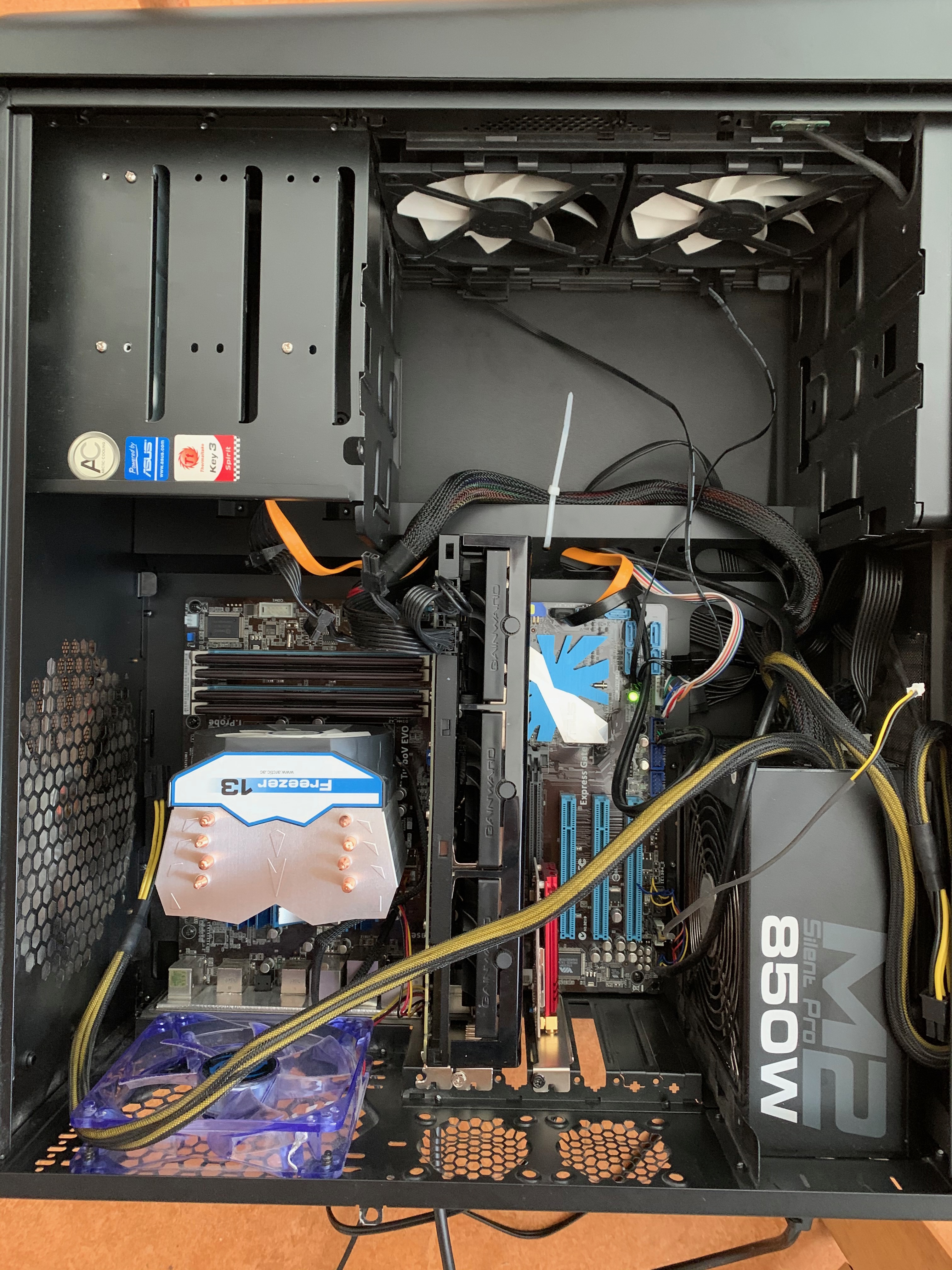 - Lüfter vorn: intake 2 x Arctic F12 PWM PST, outtake hinten 1 x 120 Revolut & oben 1 x 240 Thermaltake