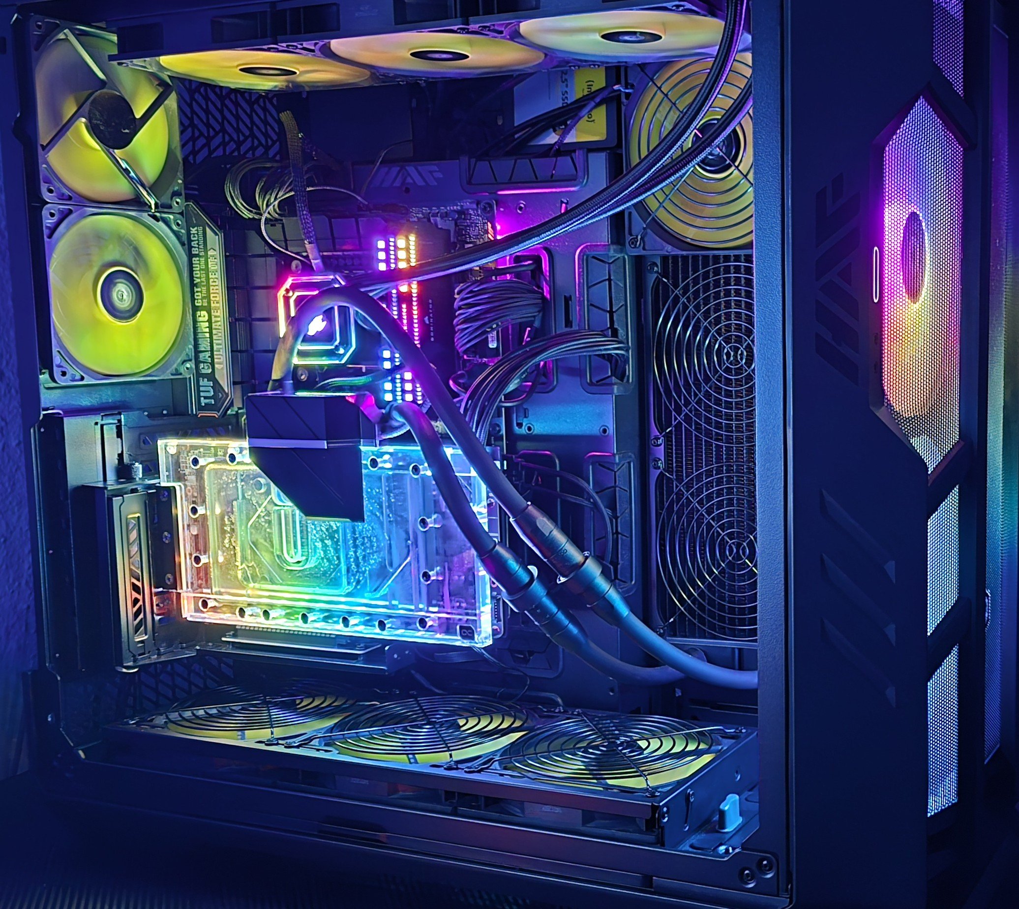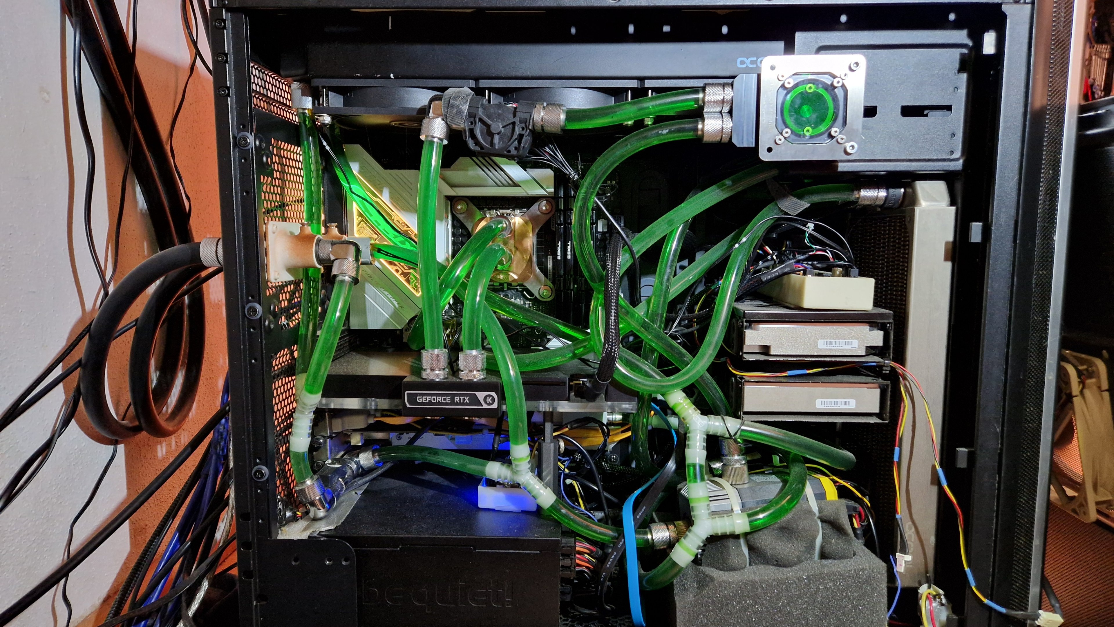 Letzter Versuch ist mein Zweit System mit dem DAN A4 H2O und einer Alphacool AIO Lösung, die überhaupt nicht passt und komplett auseinander genommen werden musste, damit es überhaupt ins Gehäuse reinpasst.