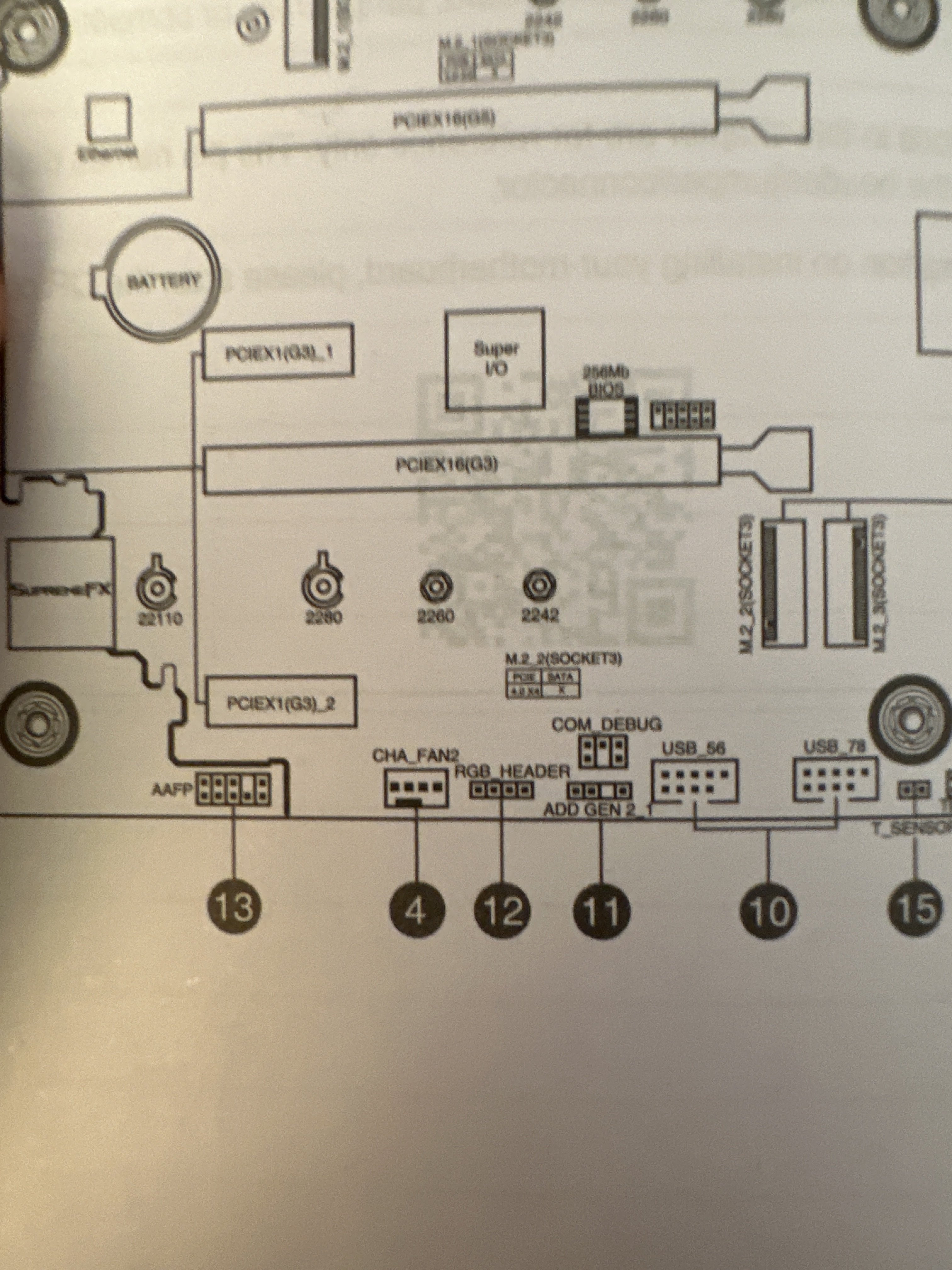 Das Mainboard hat unten drei Anschlüsse für den Stecker vom Bild 1, ADD_GEN 2_1 bis ADD_GEN 2_3, siehe Seite 26 vom Handbuch. Den Stecker mit VDG brauchst du nicht, das Mainboard hat dafür keinen Steckplatz.