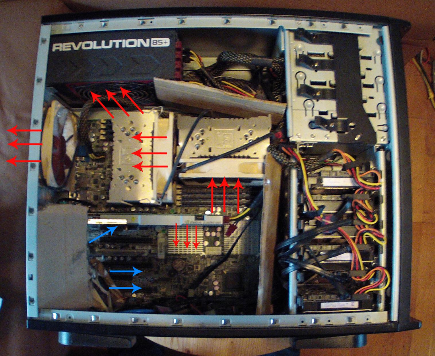 Hab mir eine neue Grafikkarte gekauft die meine Belüftung durcheinander bringt hat vielleicht jemand Tipps. Die GPU Temperatur mit 83° ist mir kommt mir im IDle doch etwas zu hoch vor. Ich hab im Anhang die derzeitige Belüftung beschrieben. Nicht enthalten dabei ist der Lüfter in der Seitentür ein Noctua 92er. Bei diesem Gehäuse ist Festplattenkühlung und Hauptraumkühlung getrennt.