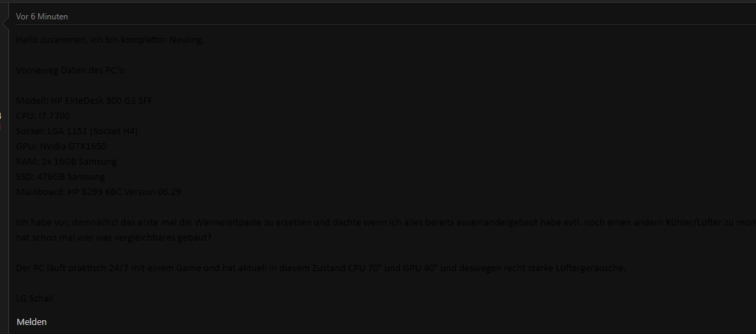 Der PC läuft praktisch 24/7 mit einem Game und hat aktuell in diesem Zustand CPU 70° und GPU 40° und deswegen recht starke Lüftergeräusche.