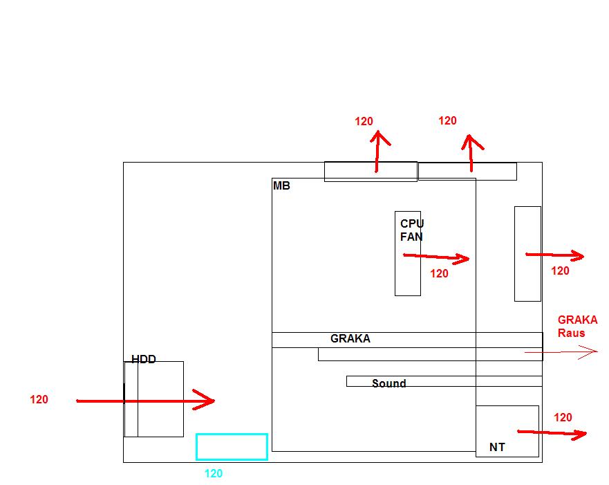 habe zzt nur einen 120 rein (vor den hdds) und 2 nach oben raus einen nach hinten (abtransport für cpu kühler) graka bläste durch doppelslot raus und netzteil auch.
