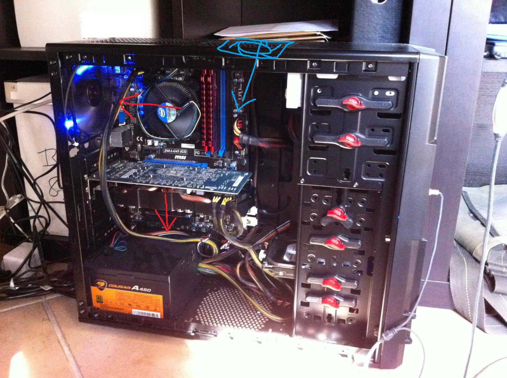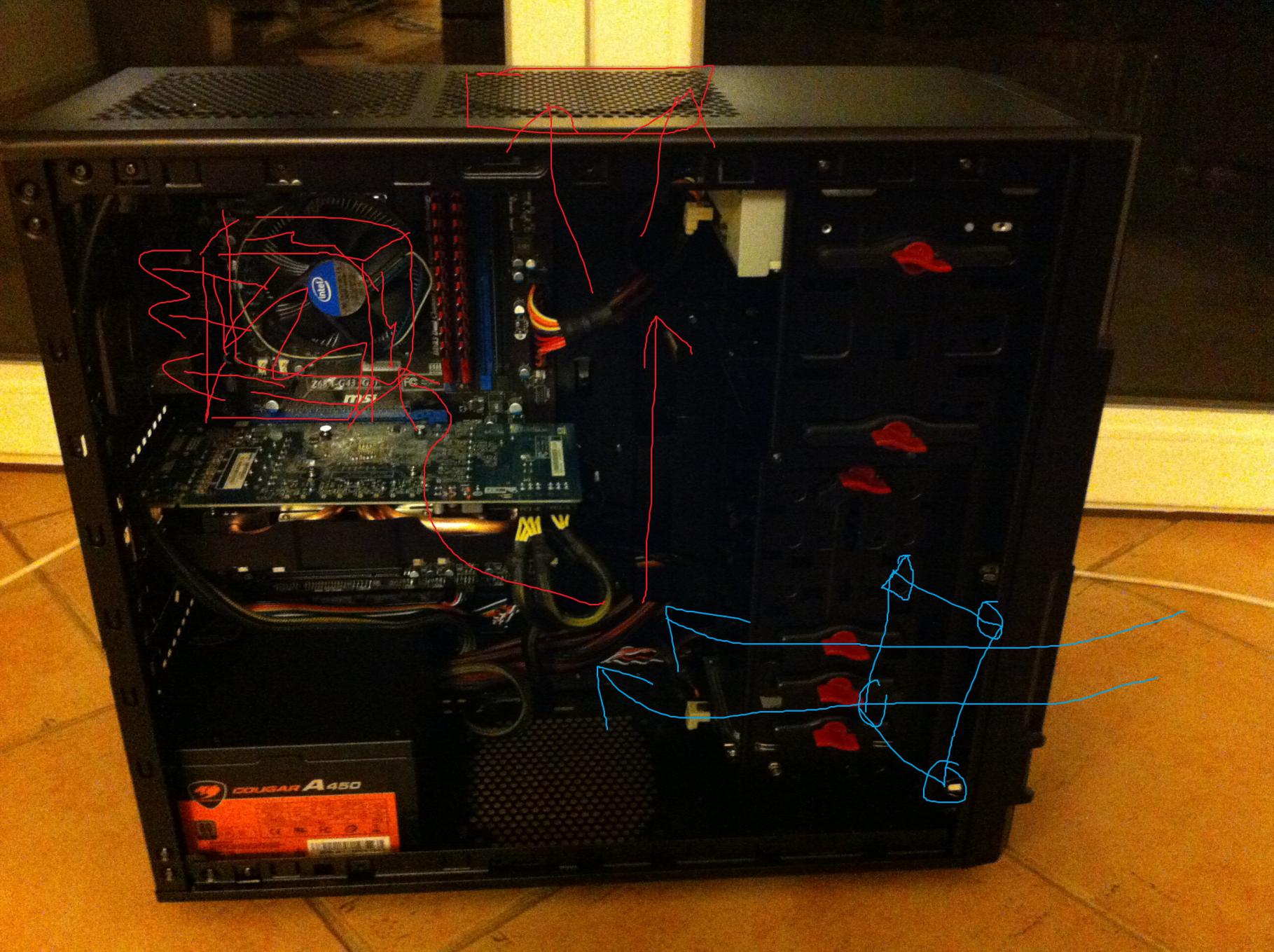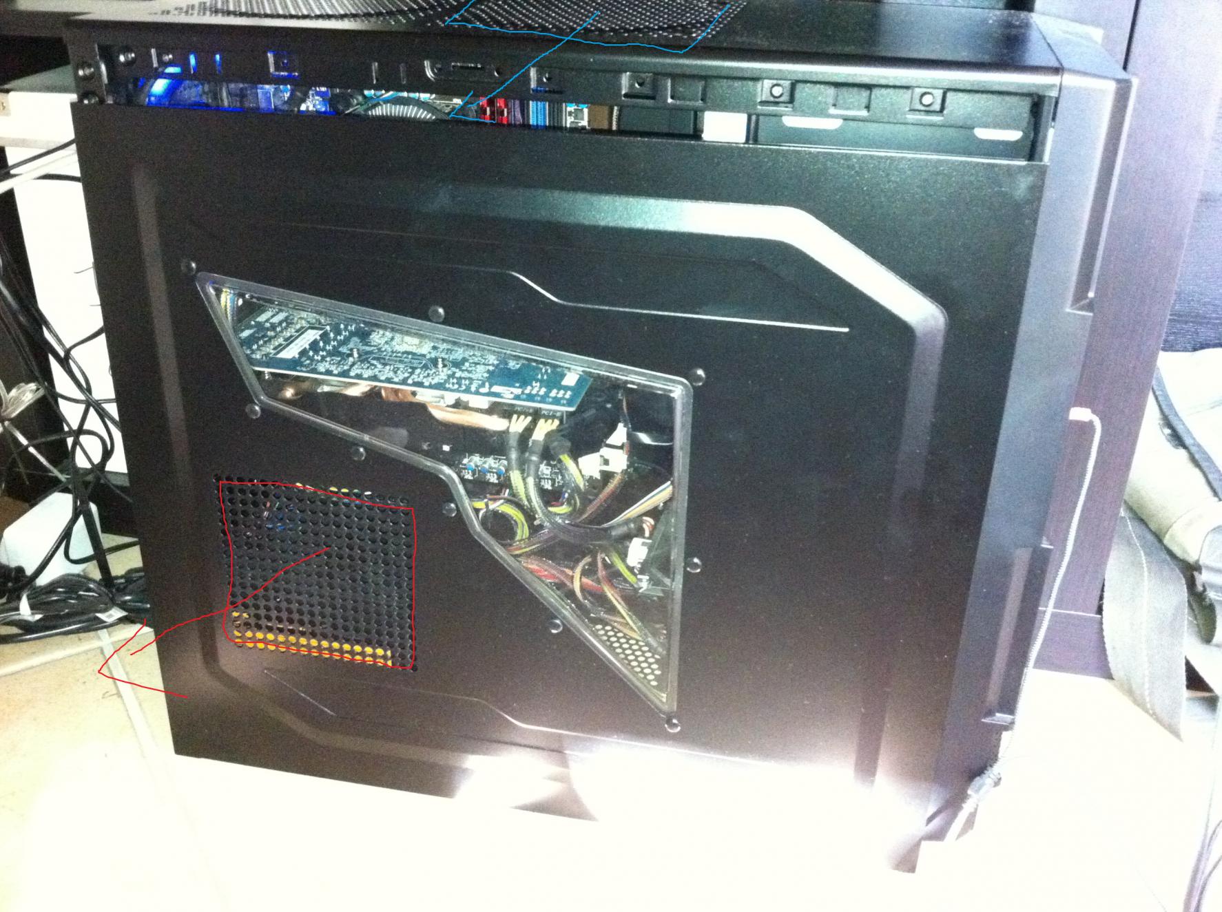 Einen der gehäuselüfter will ich an die linke seite anbringen. Dieser würde auch nach draussen pusten und die wärme die die graka erzeugt nach draussen befördern.