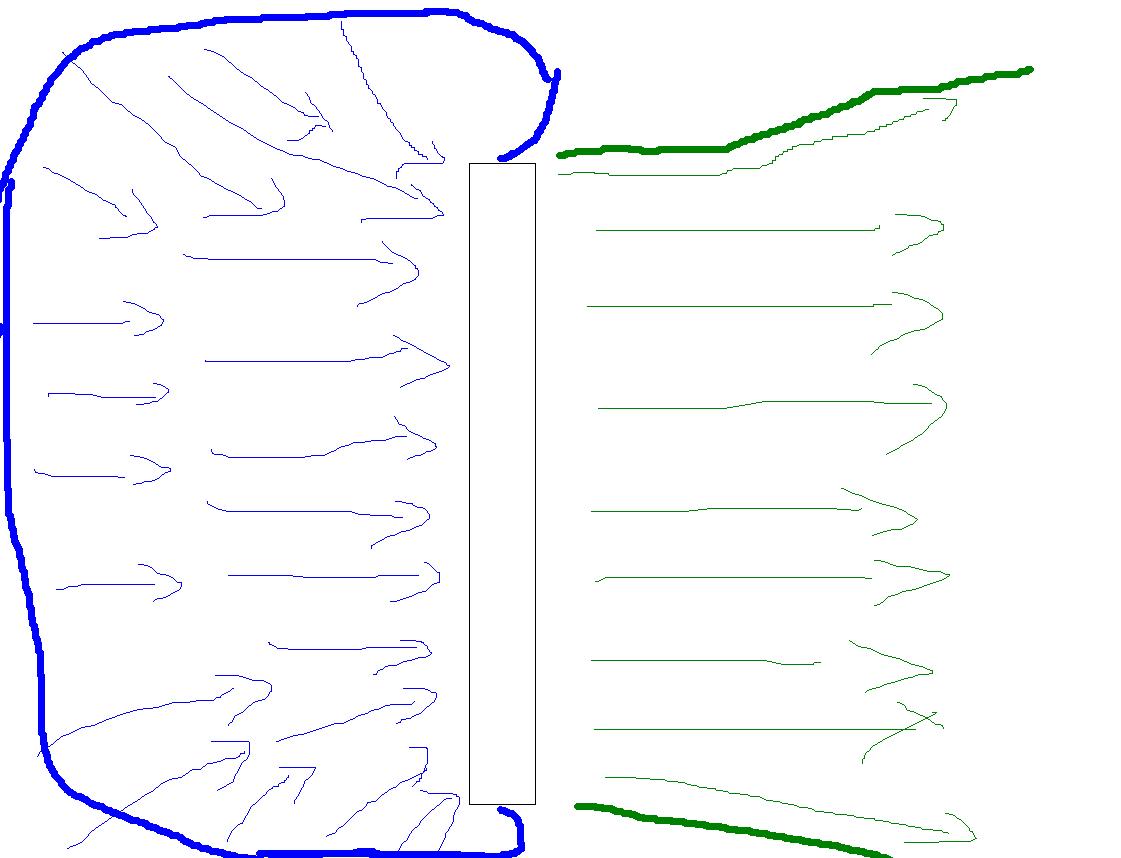 Blau stellt die saugende Seite vor - hier ist die Angriffsfläche groß - die Luftgeschwindigkeit klein; grün ist die pustende Seite - kleine Fläche - schnelle Luft!