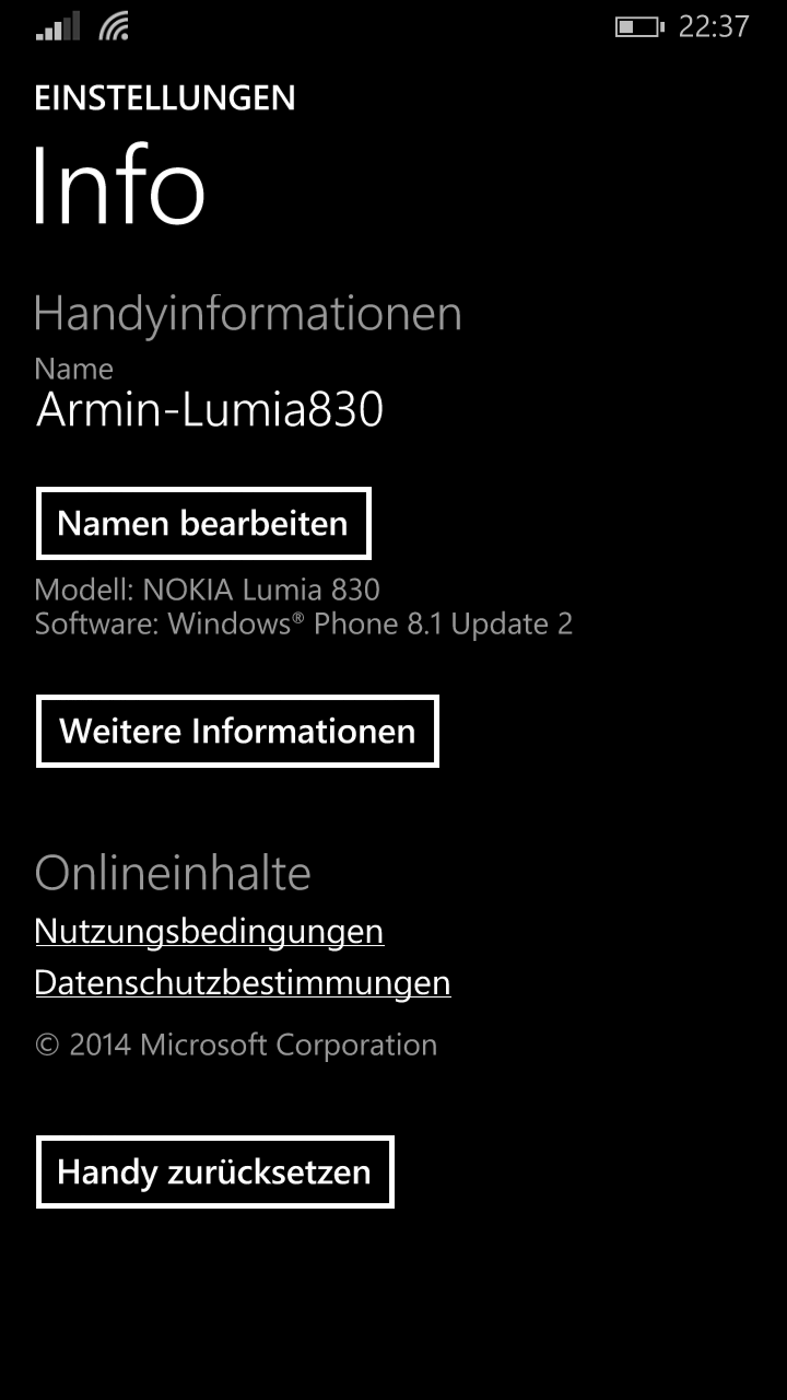 Seit Update 2 kann ich z.B. unter Einstellungen System Info einen Namen für das Lumia eingeben. Die Einstellungen sind in Netzwerk + Drahtlos, Personalisierung, Konten, System, Uhrzeit + Sprache, Eingabe + leichtere Bedienung, Datenschutz, Update + Sicherung und Extras eingeteilt.
