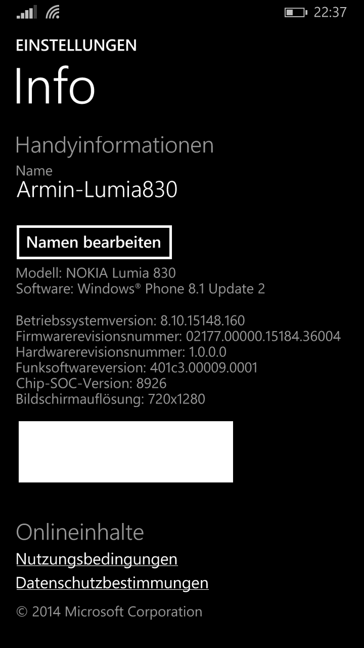 Mein Lumia 830 hat seit dem 19.06.15 die Version 8.10.14219.341. Ich warte aber auf die Version 8.10.15148.160. Das wäre Windows Phone 8.1 Update 2. In der Mobile Community wird dieses Update schon seit Anfang Juni versprochen. Meine Lumia 735 und 1020 haben es bereits seit mehr 2 Wochen installiert. Auffällig für das Update 2 ist unter Einstellungen die Wahl von einigen Oberbegriffen unter denen dann die bekannte Punkte wie Design, WLAN oder Handyupdate aufgeführt sind. Quasi die Vorstufe zu Windows 10 Mobile.
