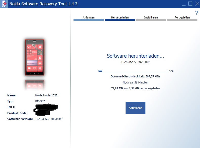Es sieht so aus, als würde er direkt WP 8.1 Wiederherstellen, denn die Versions Nummer von dem WP was er über das Recovery Tool gerade läd, ist die selbe wie ich bereits drauf habe und die selbe die in der Liste steht als letzte Version...