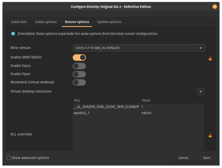 Ich habe über das Skript auf der Lutris Website Divinity: Original Sin II von GOG installiert. Das Spiel startet und läuft auf höchsten Einstellungen grundsätzlich flüssig. Aber: In unregelmäßigen Abständen flackert der Bildschirm kurz. Nachdem ich den Shader Cache im Verdacht hatte, habe ich die Variable __GL_SHADER_DISK_CACHE_SKIP_CLEANUP=1 gesetzt. Leichte Besserung, aber noch immer noch angenehm spielbar.