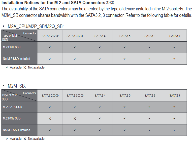 Chipset:- 2 x M.2 connectors (Socket 3, M key, type 22110/2280 PCIe 4.0 x4/x2 SSD support) (M2P_SB, M2Q_SB)- 1 x M.2 connector (Socket 3, M key, type 22110/2280 SATA and PCIe 4.0 x4 SSD support) (M2M_SB)