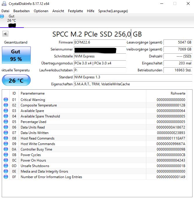Oben rechts die Schreibmenge, deine Silicon Power hat jetzt 7069 GB geschrieben, also knapp 7 TB.