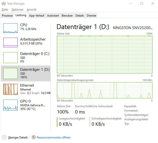 ich habe seit ca. einen Monat von Zeit zu Zeit (zuletzt heute) immer wieder das Problem dass manchmal beim Zocken die Datenträgerauslastung meiner M.2 SSD, wo meine ganzen Games gelagert sind, plötzlich auf 100% Auslastung aufdreht und dort dann auch bleibt (auch wenn ich alle offenen Programme schließe und/oder den PC neu starte). Ich hab schon einige Dinge ausprobiert unteranderem bin ich einigen Guides, unteranderem diesen hier -> (https://recoverit.wondershare.de/windows-10/solved-windows-10-100-disk-usage-in-task-manager.html) gefolgt und kam dabei leider auch nie zu einer Lösung. Hab auch bereits die SSD auf Dateisystemfehler überprüft wobei auch nichts rauskam. Bei Virenscans wurde auch nichts gefunden. Hab heute die SSD einmal kurz ausgebaut, auf Schäden geprüft und dann wieder eingebaut, leider löste das das Problem auch nicht. Langsam bin ich mit meiner Technik-Kompetenz am Ende, deshalb will ich hier einmal nachfragen ob irgendwer schonmal einen solchen Fehler hatte bzw. ob es dafür ggf. auch eine Lösung gibt.