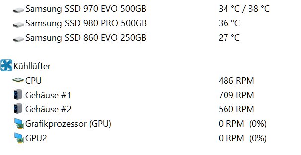Ohne zusätzliche Kühlkörper. Anbei ein Bild. Dabei relativ wenig Gehäuselüfter (2x Gehäuse, 1 x CPU) verbaut. Raumtemp. aktuell 21 Grad Celsius. Rechner läuft seit 2 Stunden = schreiben, surfen, etc. . Lüfterkurven per Software. Unter Last drehen die Lüfter hoch.