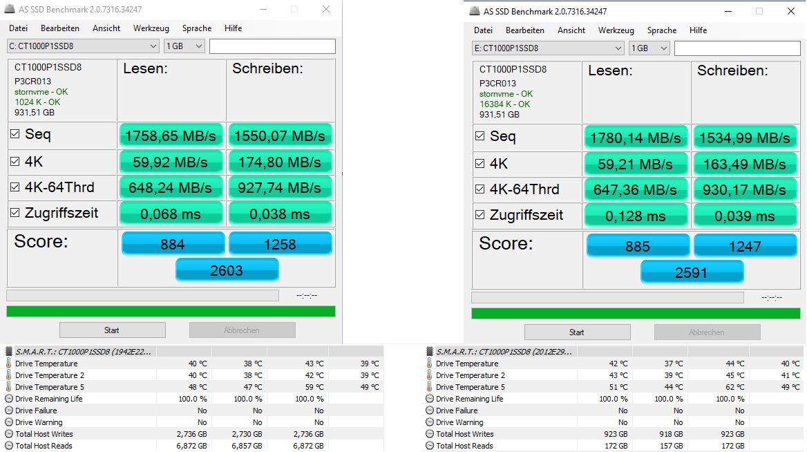 Anbei ein AS SSD Benchmark von Platte 1 und 2 mit den dazugehörigen Temperaturen mit HWinfo