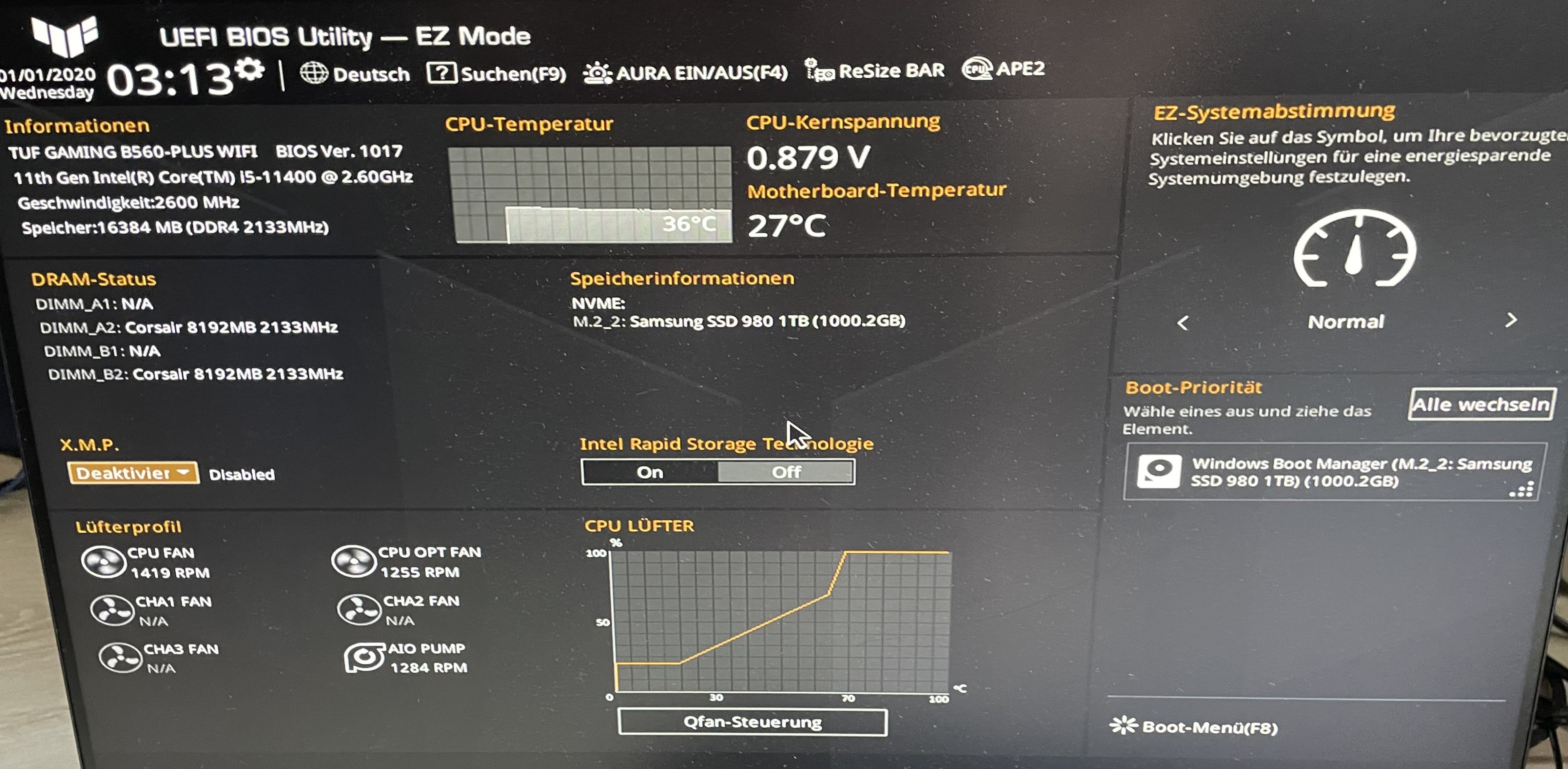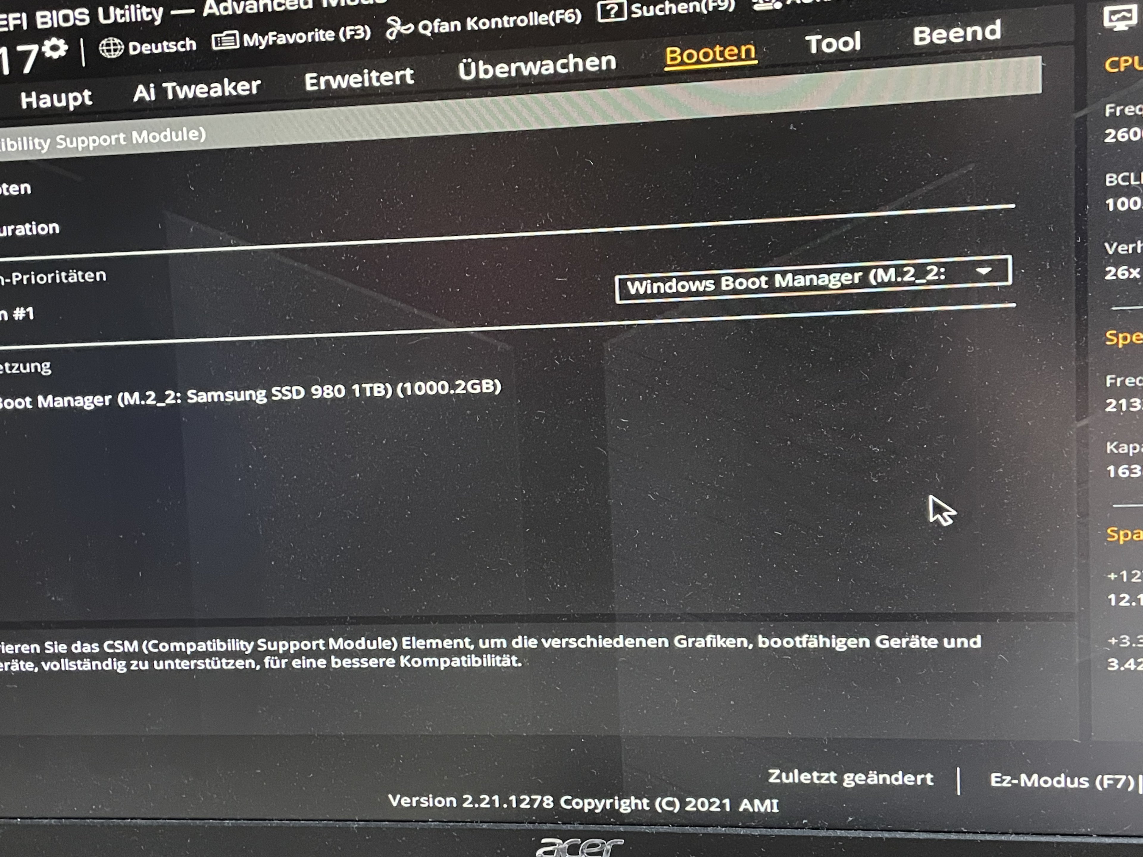 ich habe einen Pc zusammengestellt und zwar mit einer SSD M.2 980 von Samsung und CPU i5 11th gen kein F oder K Version sondern die normale und mainbaord von Asus TUF Gaming B560 Gaming Plus Wifi.