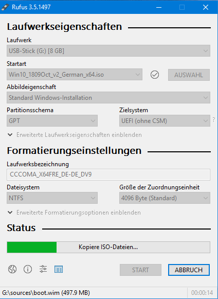 Du klickst hier einfach nur noch auf "Start" und Rufus erstellt das Installationsmedium und sagt dir