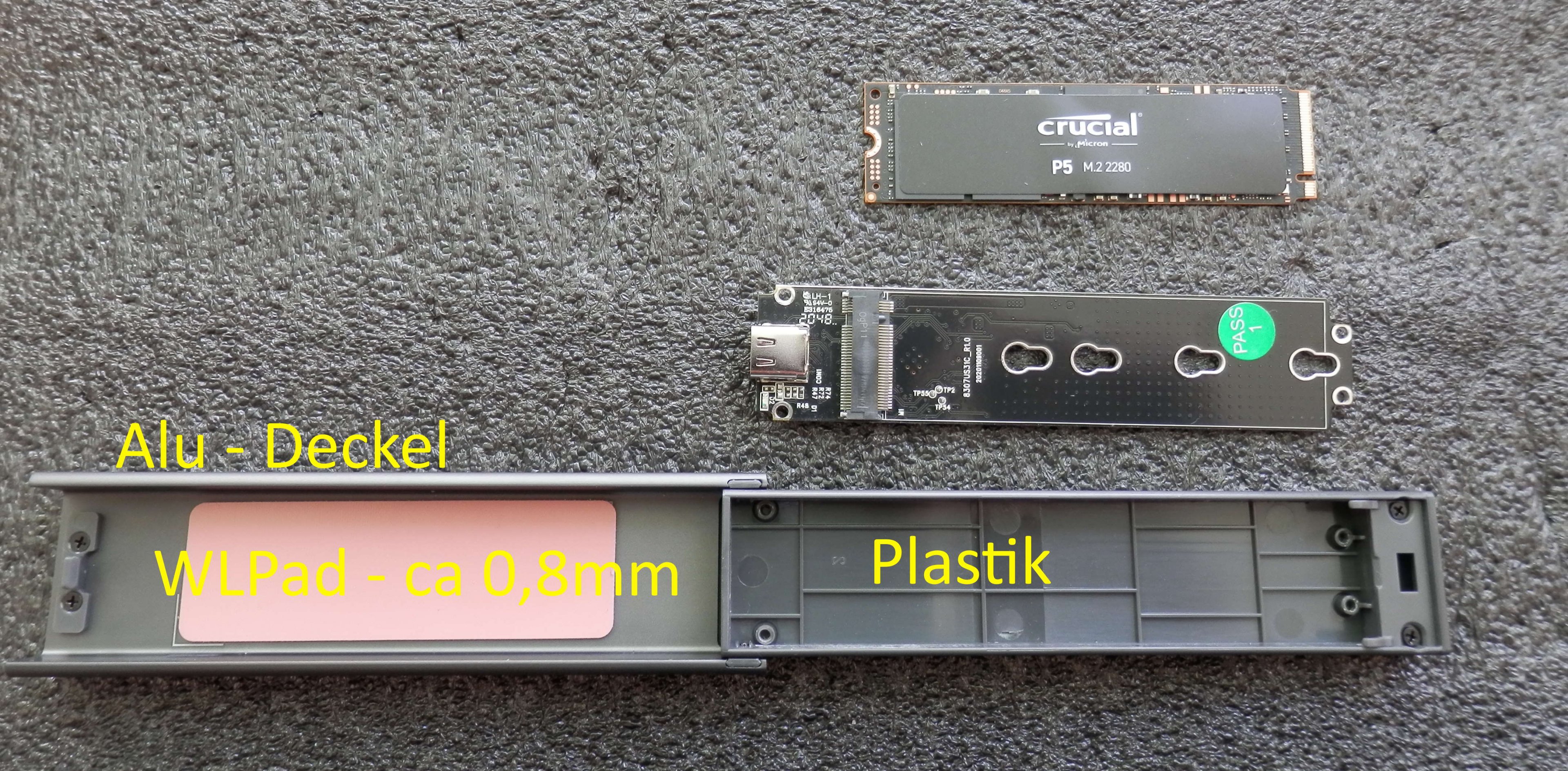ABER: Nur die Oberseite ist aus Alu, die Unterseite aus Plastik. Schade. Dazu gesellen sich noch andere Dinge wie zb. das der Controllerchip auf der Basisplatine auf der Plastik-Seite in der Luft, also ohne Kühlmöglichkeit hängt. Weiterer Kritikpunkt ist, das bezogen in Kombination mit der P5 SSD die Gummi - Arretierung Real höher ist als die SSD selbst, also nach dem zusammenklappen bereits den Deckel berührt. Das Wärmeleitpad am Deckel berührt nur ca. 0,5 cm² der SSD, und nur da wo der SSD Interne Controllerchip als höchsten Punkt sitzt, was schlecht ist, ergo ist das Pad selbst viel zu dünn. Schätze mal 0,8mm.