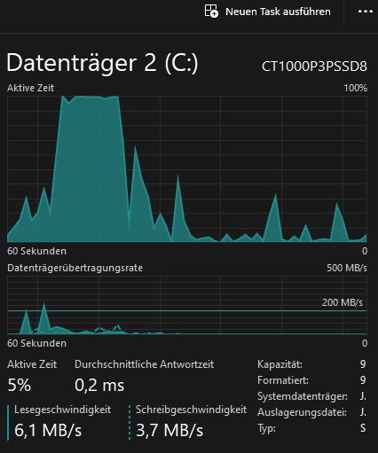 Also das die SSD auf 100% geht passiert halt allein beim Start vom Taskmanager im Leerlauf, also nicht anderes offen wie man als Ausschlag auf dem ersten Bild sieht. Da ist die SSD auf 36° und beim 2. BIld im Task Manager hab ich den Browser geöffnet. War dann bei 37°. Das Gehäuse hat ne Mesh front. Die CPU wird meist wärmer als die GPU. Die SSD sitzt auf dem 2. Slot und die Samsung auf dem ersten, da der erste Slot damals immer bis 60°+ ging beim zocken aber eigentlich nie höher als 65°. Das Gehäuse wird beim Zocken wirklich sehr heiß aber laut CrystalDiskInfo nicht annähernd an die 75°. Ich würd aber auch sagen sobald der PC wärmer wird, ist die Auslastung öfters höher und die aktive Zeit springt öfters. Die Antwortzeit ist trotzdem immer zu hoch. Im 3. Bild nochmal in Marvel Rivals Hauptmenü. Das 4. Bild auch, also kein Plan was das genau Auslöst, zu warm ist es Aktuell nicht, nur CPU auf 73° und SSD auf 37°. Im laufenden spiel dann im 5. Bild zu sehen. Temps CPU 73°, GPU 68.5°, SSD 36°-41°. Bei längerem Spielen geht die CPU gern mal über die 80° und GPU auf 72° und SSD auf 46°.