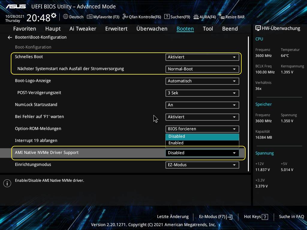 Gibt es z B. das "M.2_1 (PCIE) : Not Detected", wie in dem oben geposteten Screenshot des/eines Asrock-Boards zu sehen? Und weitere, wie "Native NVMe Driver Support", nicht zu vergessen "Fast Boot: Disabled" um neu hinzugefügte Geräte erkennen zu können.